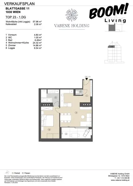 Die Einheit Top 23 verfügt über eine Wohnfläche von ca. 57,98 m² inklusive Loggia mit ca. 6,54 m² sowie ein Kellerabteil mit ca. 2,08 m², das im Kaufpreis inkludiert ist.