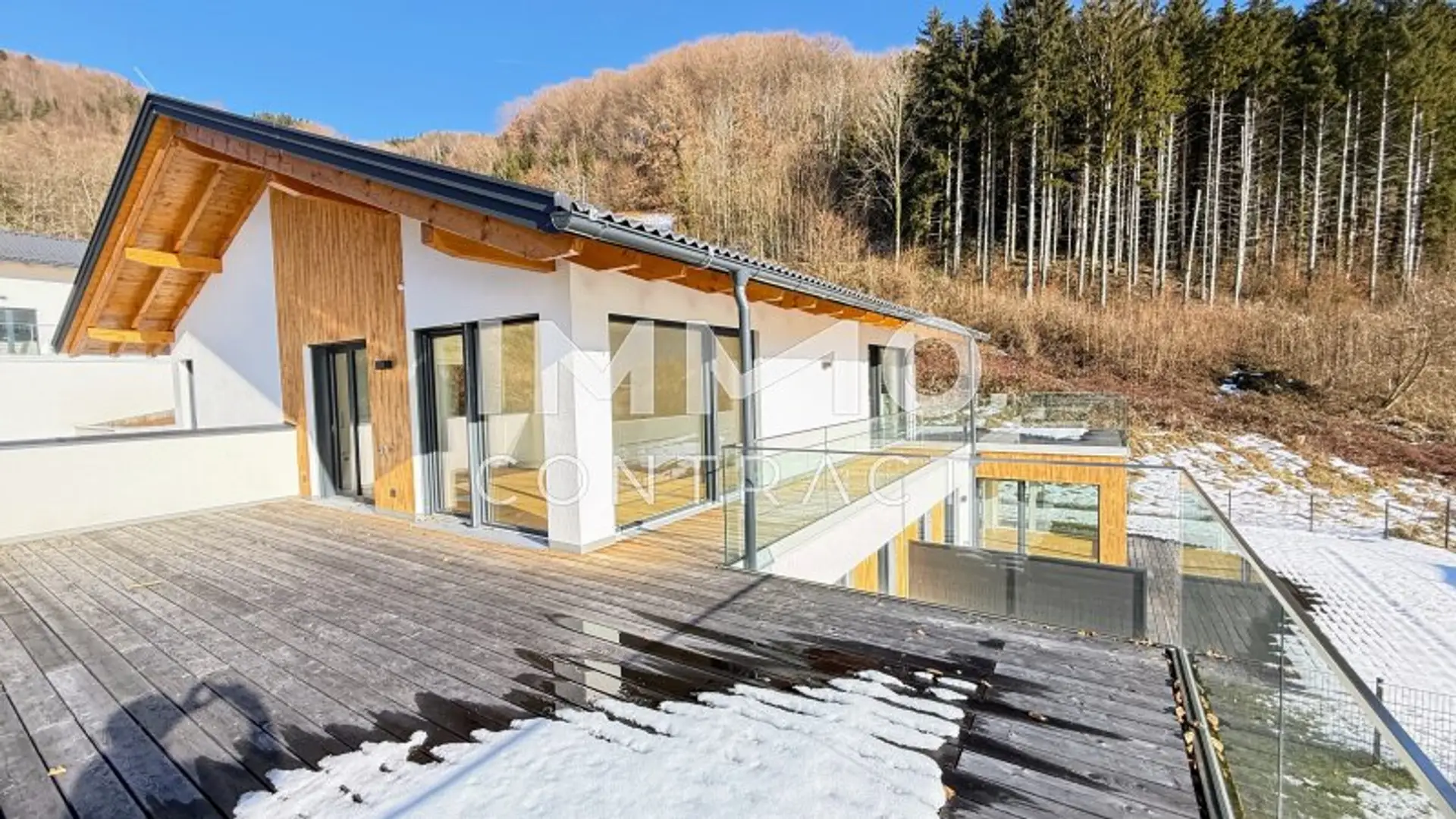 • Südseitige 96 m² Terrasse mit Glasgeländer und Blick auf den Mondsee