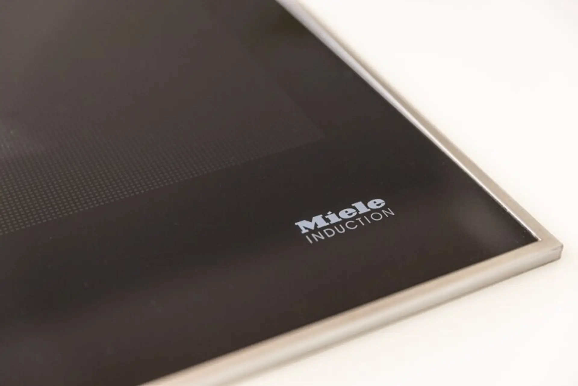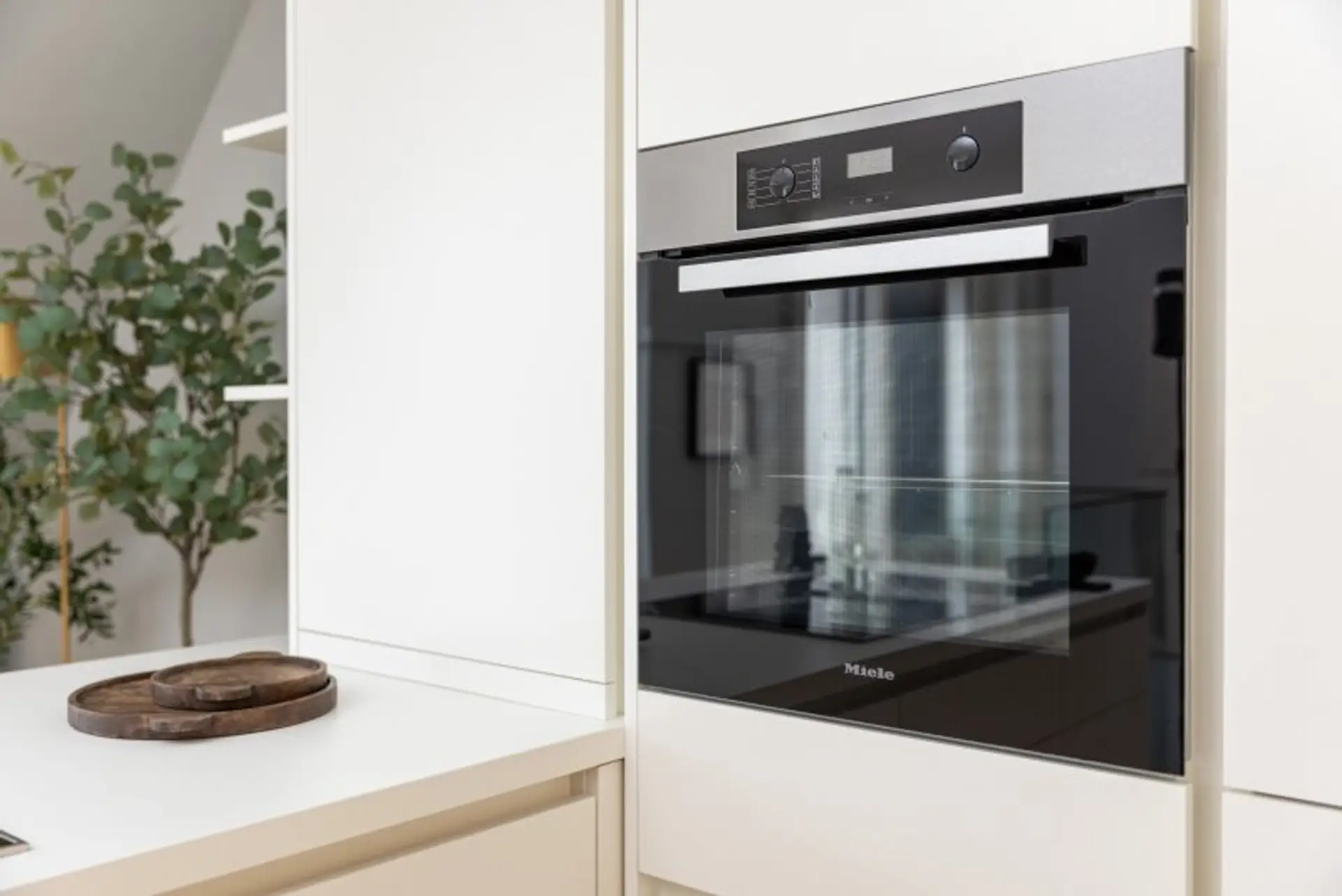 Die Küche ist in schlichtem weißen Hochglanz gehalten und mit hochwertigen Miele-Geräten inklusive Induktionsherd ausgestattet.