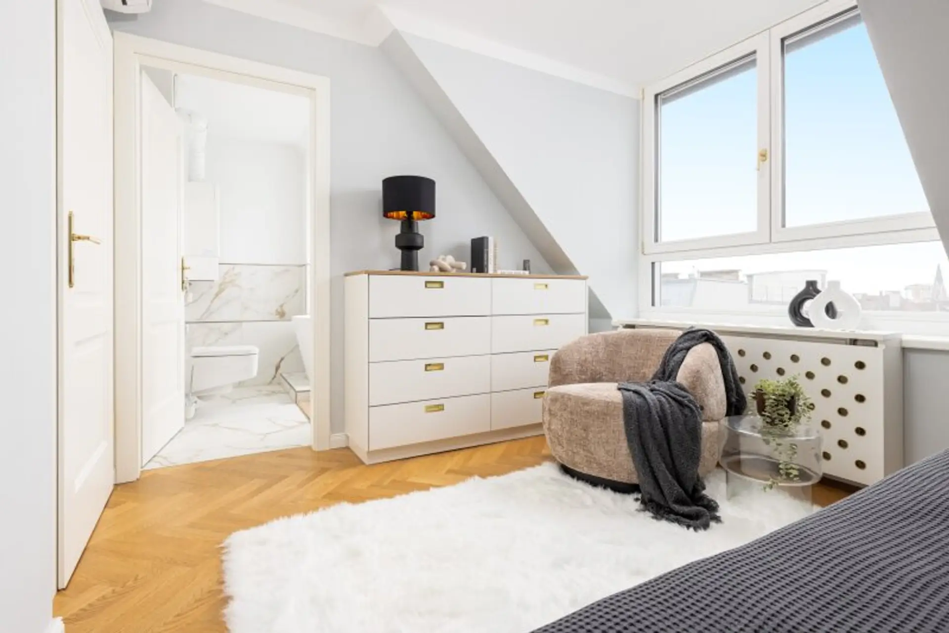 Das Schlafzimmer bietet auf ca. 13 m² ausreichend Platz, um ein großes Doppelbett zu platzieren. Das angeschlossene Bad en Suite ist mit einer freistehenden Badewanne, einem Doppelwaschtisch sowie einer Toilette ausgestattet und liegt im hinteren Teil der Wohnung. Ein Schrankraum mit knapp 13 m² bietet idealen Stauraum für Schränke und diverse Utensilien des Haushalts. Daran angrenzend befindet sich ein weiteres hochwertig ausgestattetes Badezimmer von 6,60 m² Größe mit einer Dusche, einem Doppelwaschtisch und einem Waschmaschinen-Anschluss. Eine separate Gästetoilette ist vom Wohnbereich zu begehen und rundet, gemeinsam mit einem zusätzlichen Ausgang ins Stiegenhaus das Wohnungsangebot ab.
