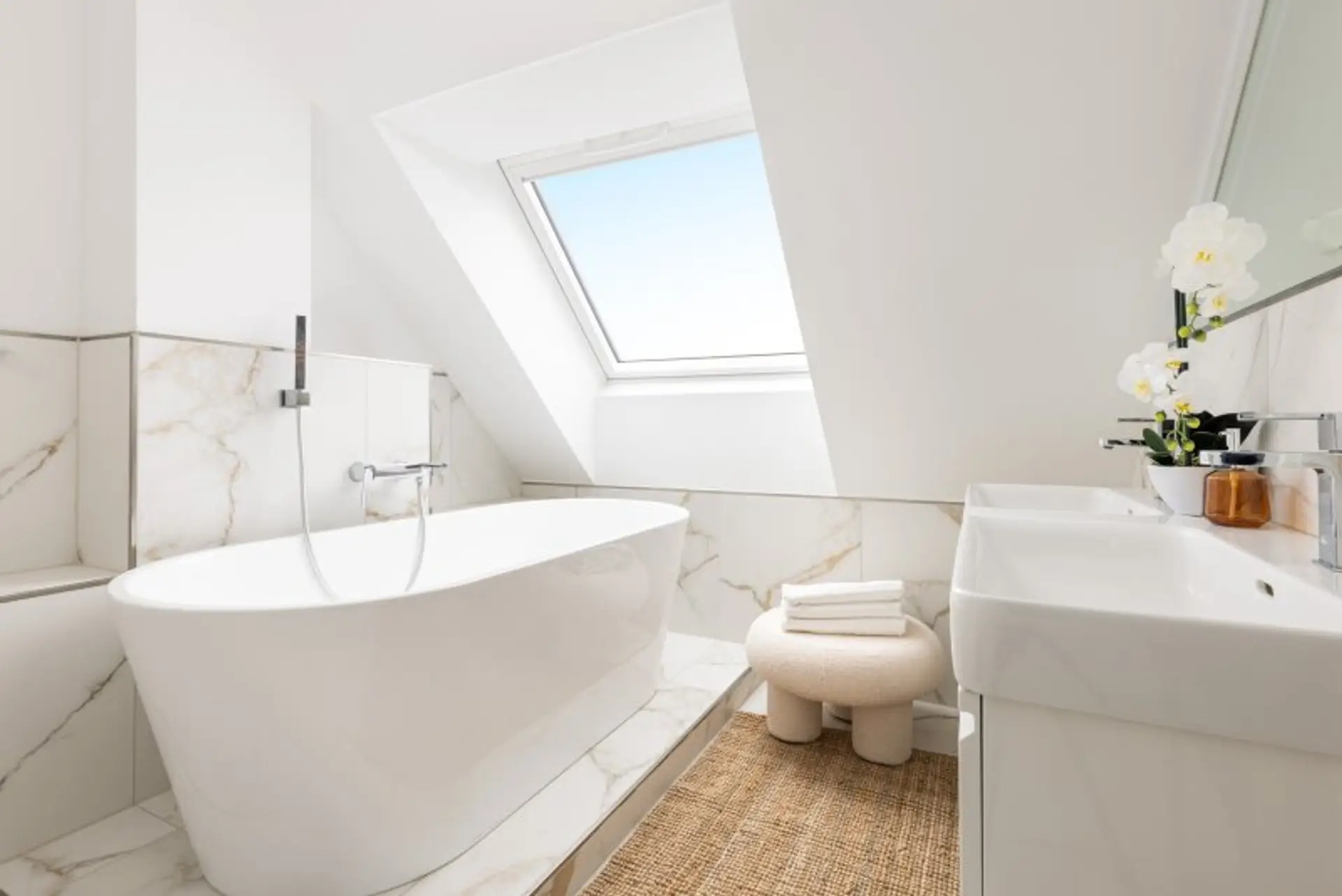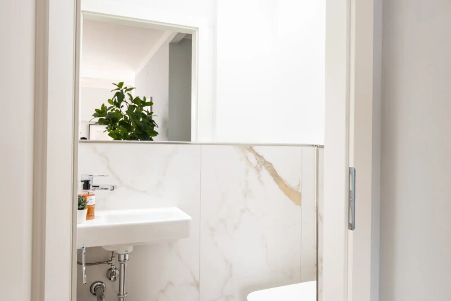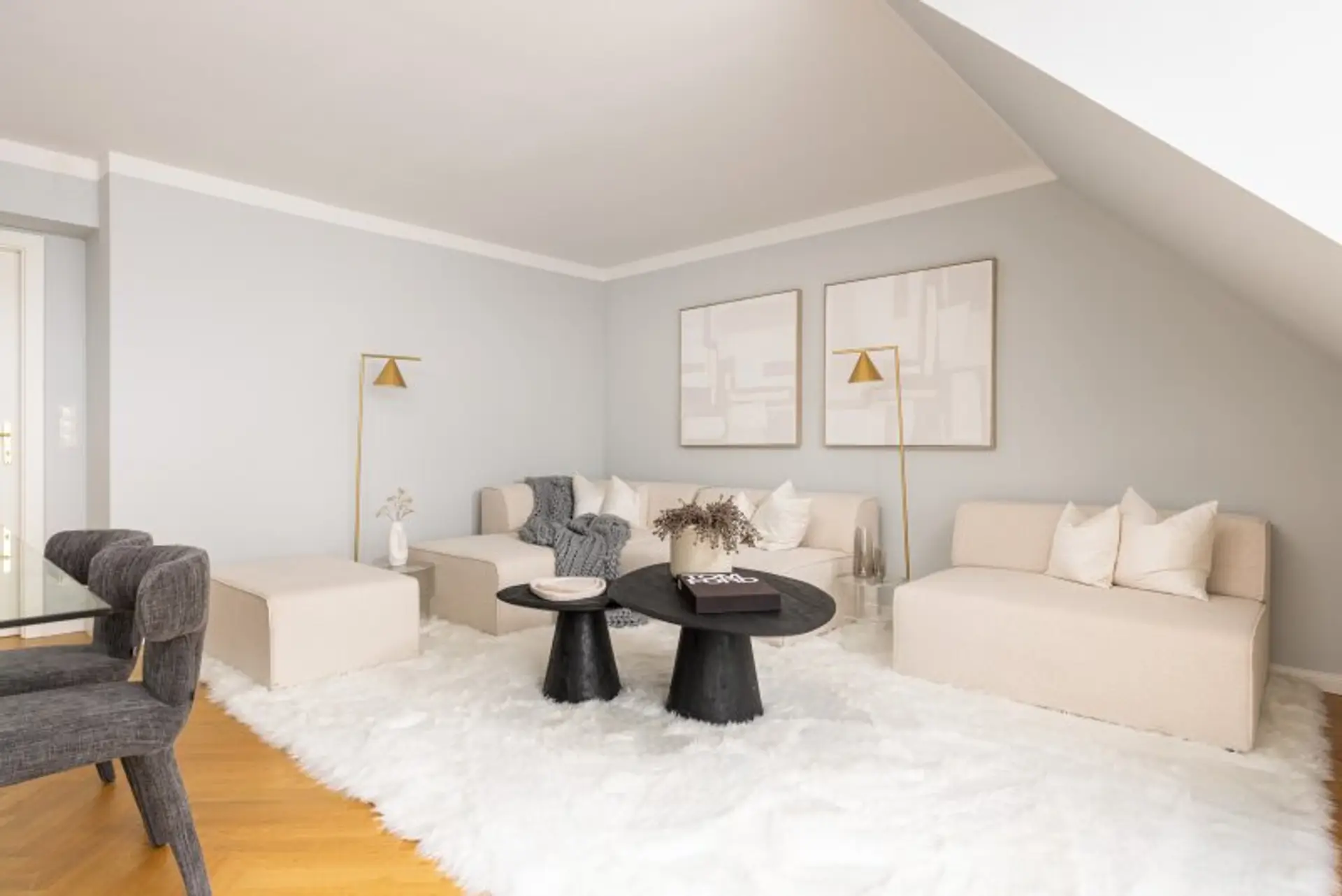 Sämtliche Wohnbereiche wurden mit edlem Fischgrät-Parkett, die Nassräume mit großflächigen Fliesen in Marmoroptik versehen.