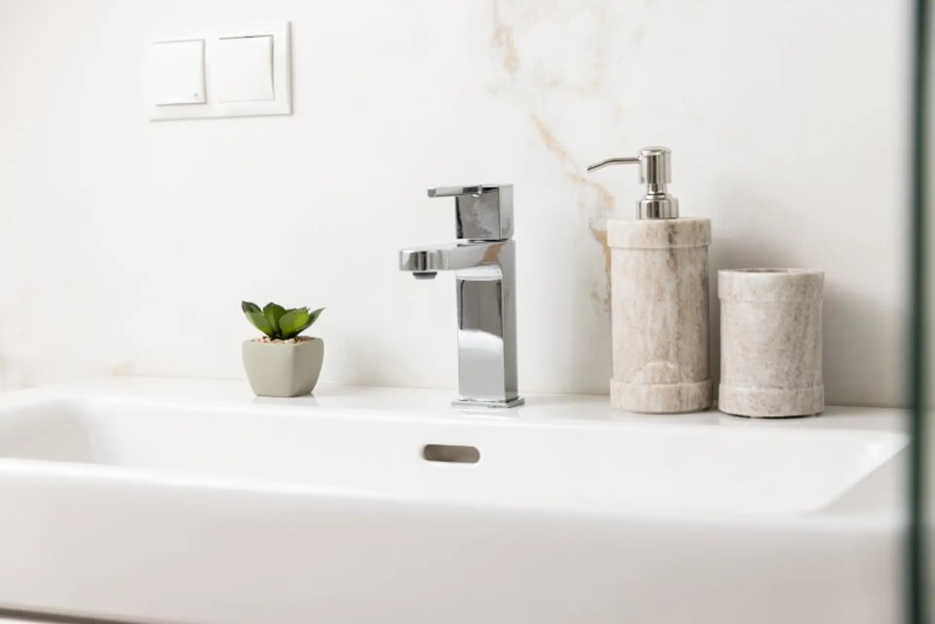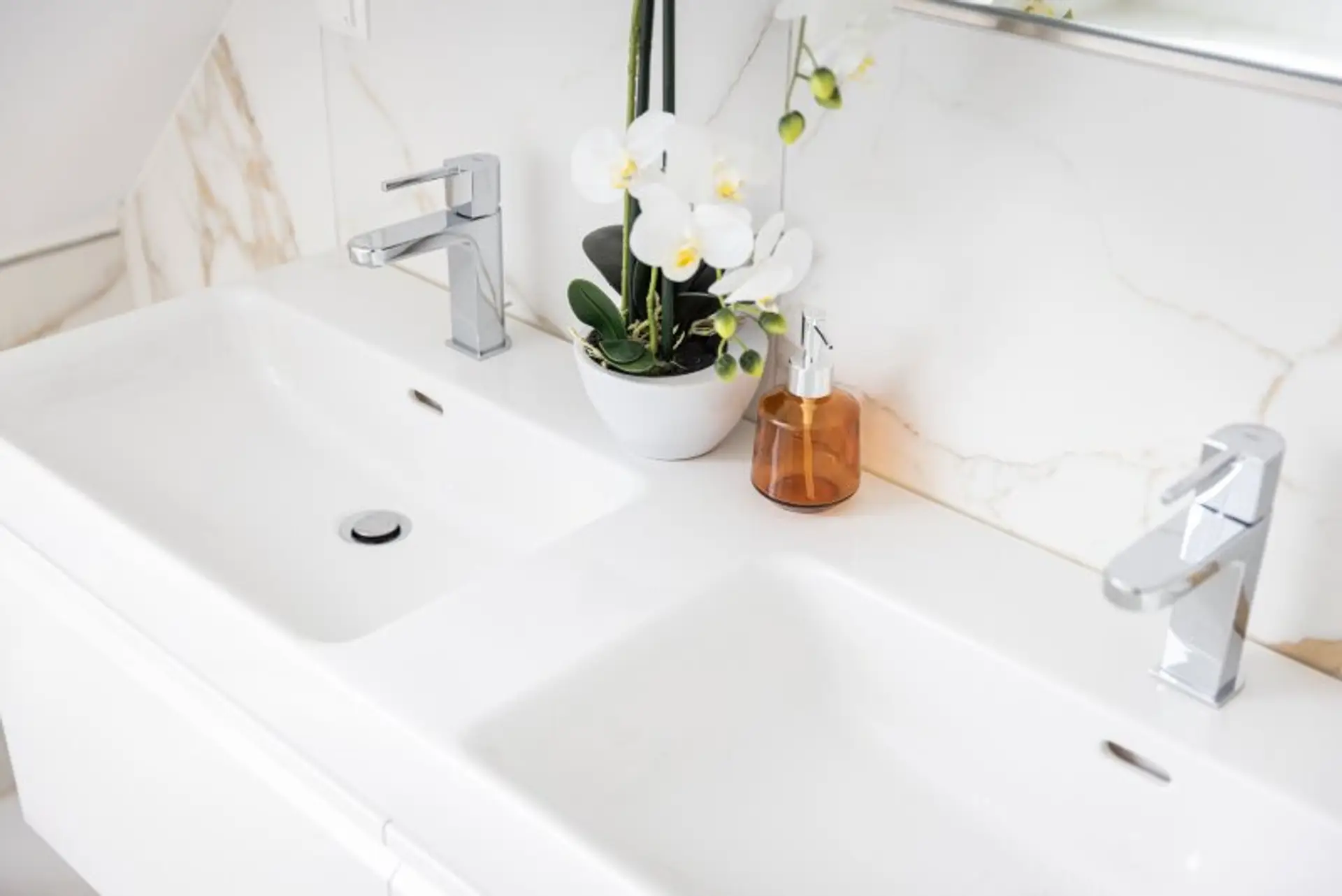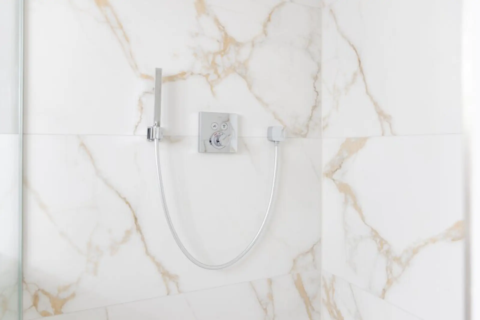 Sämtliche Wohnbereiche wurden mit edlem Fischgrät-Parkett, die Nassräume mit großflächigen Fliesen in Marmoroptik versehen.