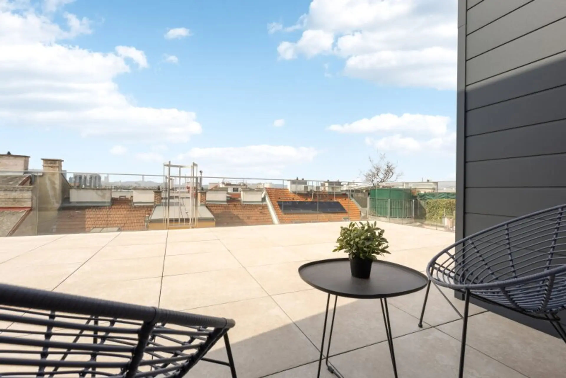 Die nach Süd-West ausgerichtete Terrasse mit rund 52 m² bietet einen herrlichen Blick auf den Kahlenberg und die Wienerberg City.