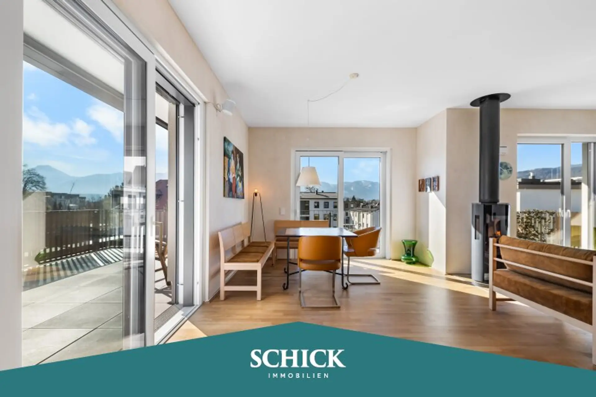 Der offene Wohn und Essbereich mit Kamin öffnet sich über große Panoramaschiebetüren zur dreiseitig umlaufenden Dachterrasse. Der Ausblick ist spektakulär und jeden Tag neu: morgens das erste Licht über der Drau, abends der Sonnenuntergang über den Bergen. Hier spielt das Leben im schönsten Licht.
