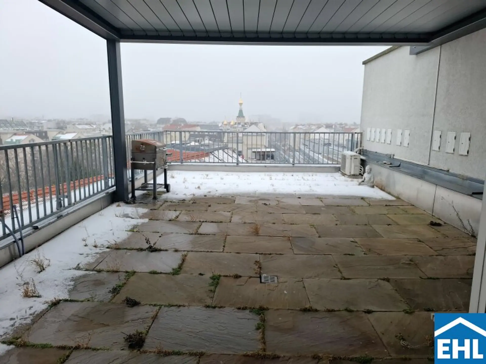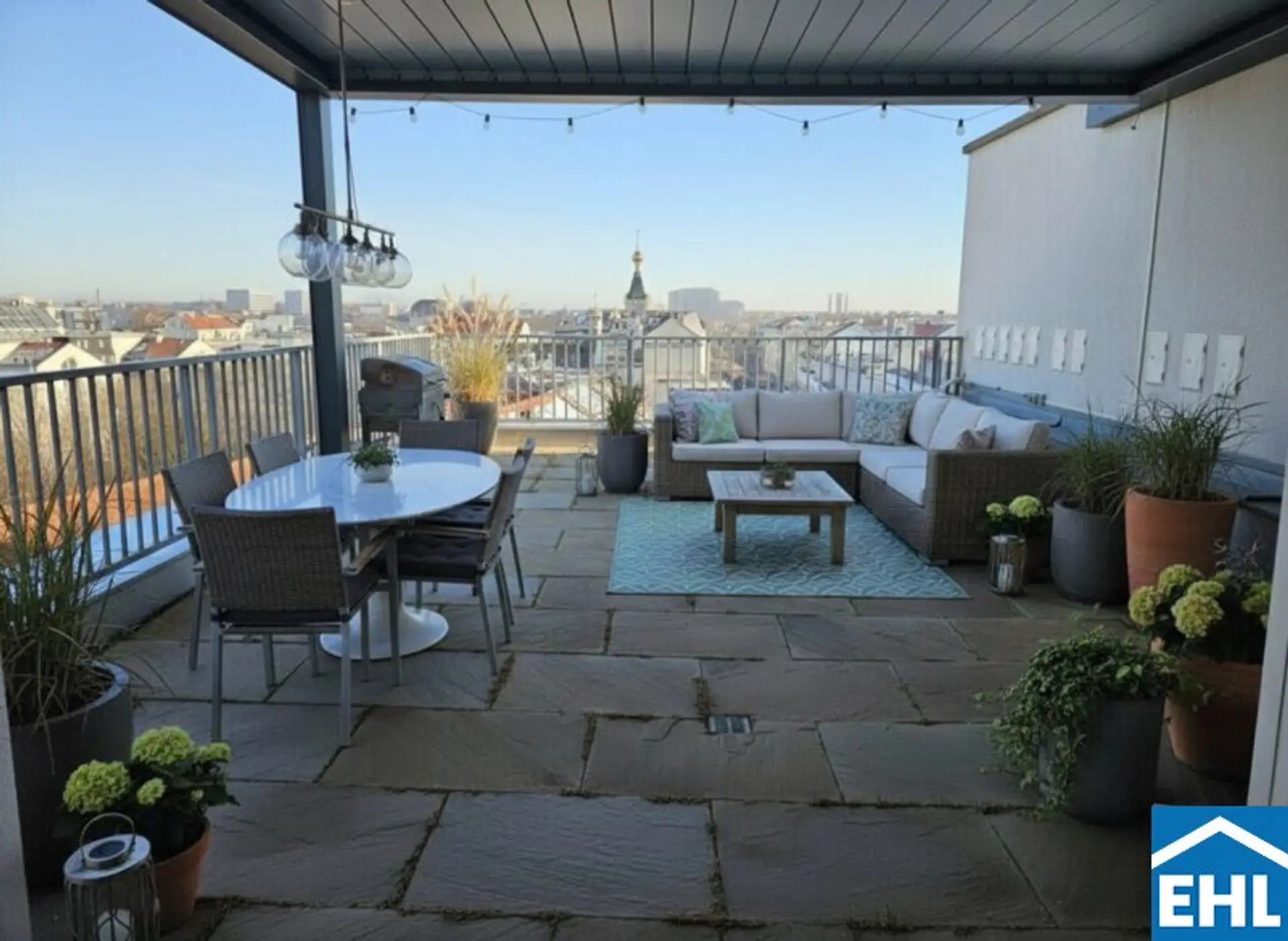 Das absolute Highlight wartet im Freien: Die ca. 54 m² große Dachterrasse. Ob Loungemöbel, Dinner unter freiem Himmel oder entspannte Stunden über der Stadt – hier genießen Sie einen unvergesslichen Blick über die Dächer Wiens. Eine moderne Pergola mit komplett verschließbarem Dach und seitlichen Rollos schafft einen privaten, wettergeschützten Rückzugsort.