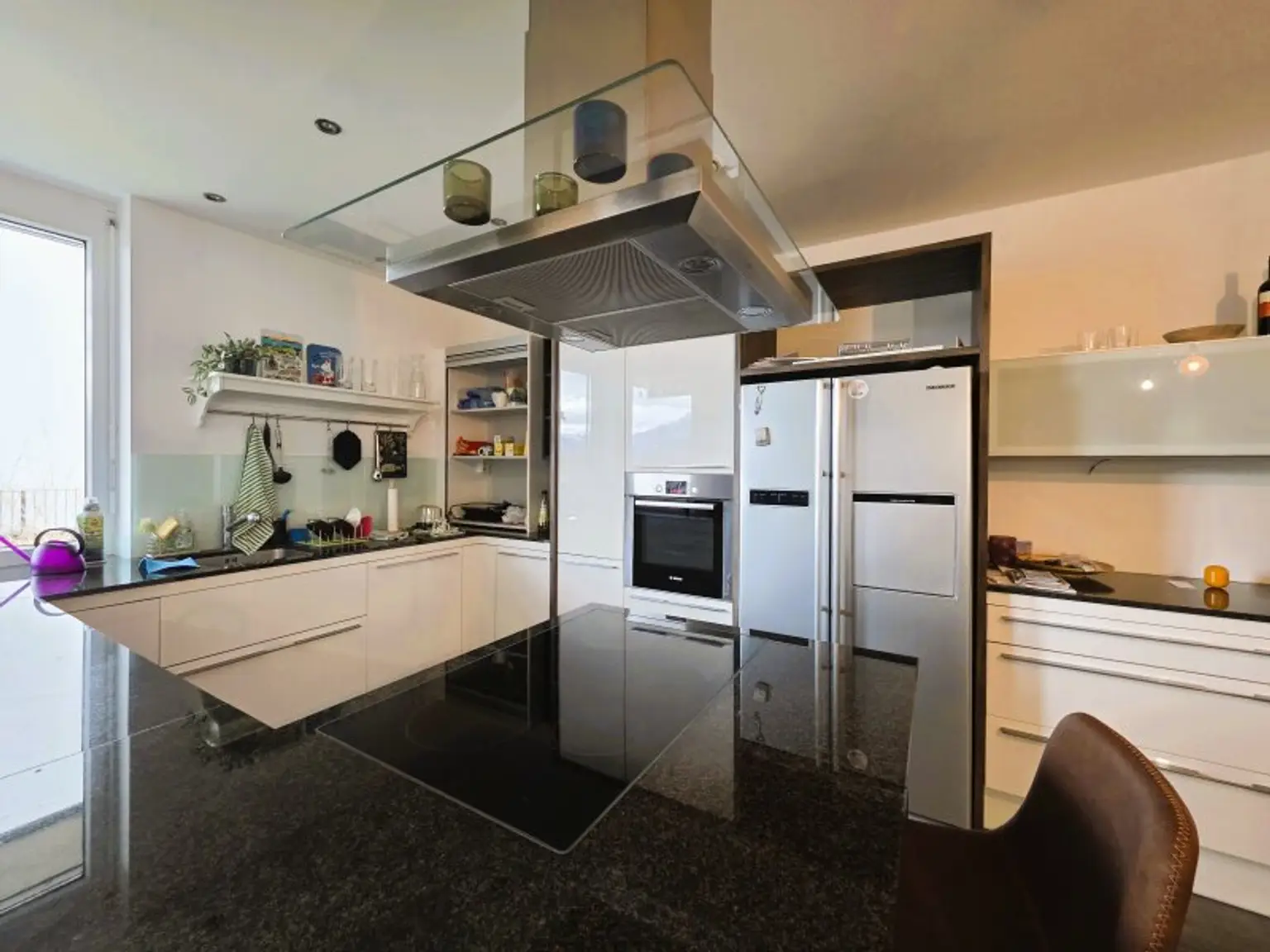 Herzstück der Wohnung ist der beeindruckend große Wohn-, Koch- und Essbereich mit rund 44 m². Die hochwertige Küche überzeugt mit durchdachter Ausstattung, viel Arbeitsfläche und bietet beste Voraussetzungen für angenehmes Kochen mit Blick in die umliegende Berglandschaft.