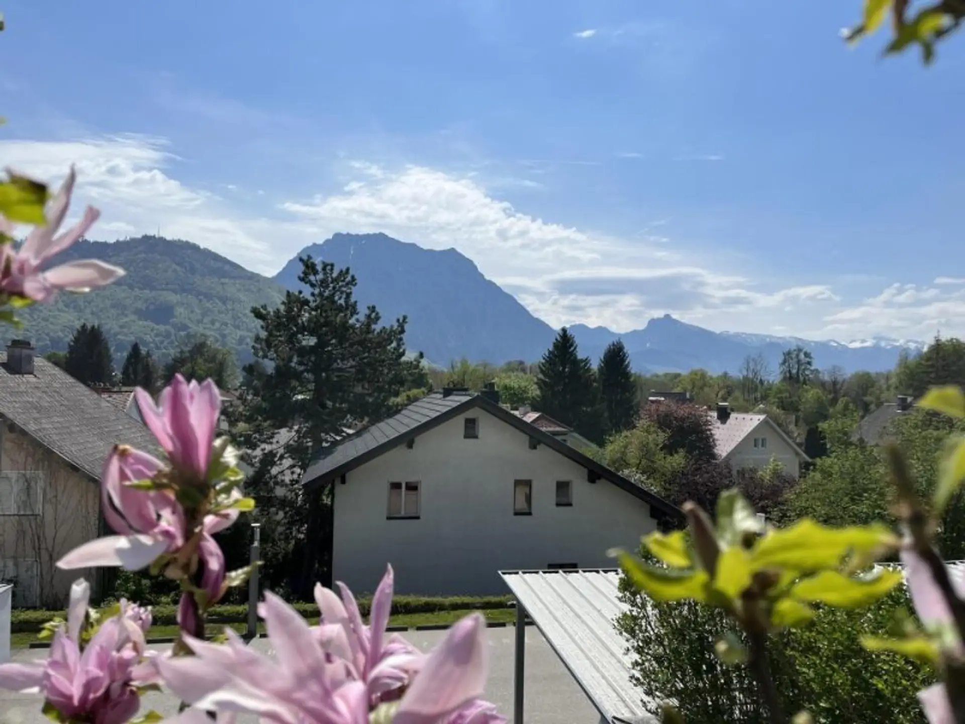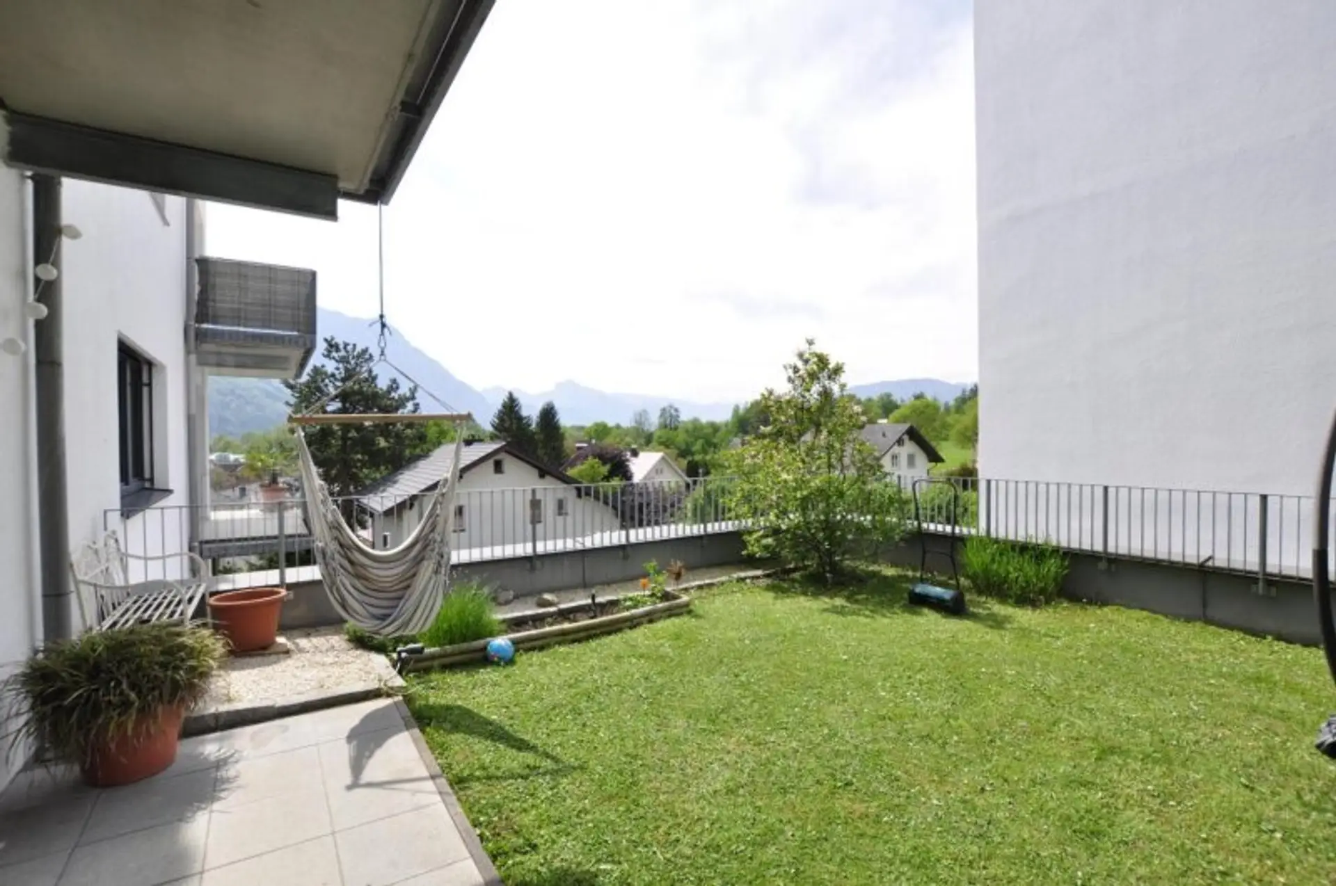Sowohl vom Wohnzimmer als auch vom Elternschlafzimmer aus gelangt man auf die Terrasse und in den eigenen Garten. Von hier genießt man einen wunderbaren Ausblick auf den Traunstein und die umliegende Bergwelt.