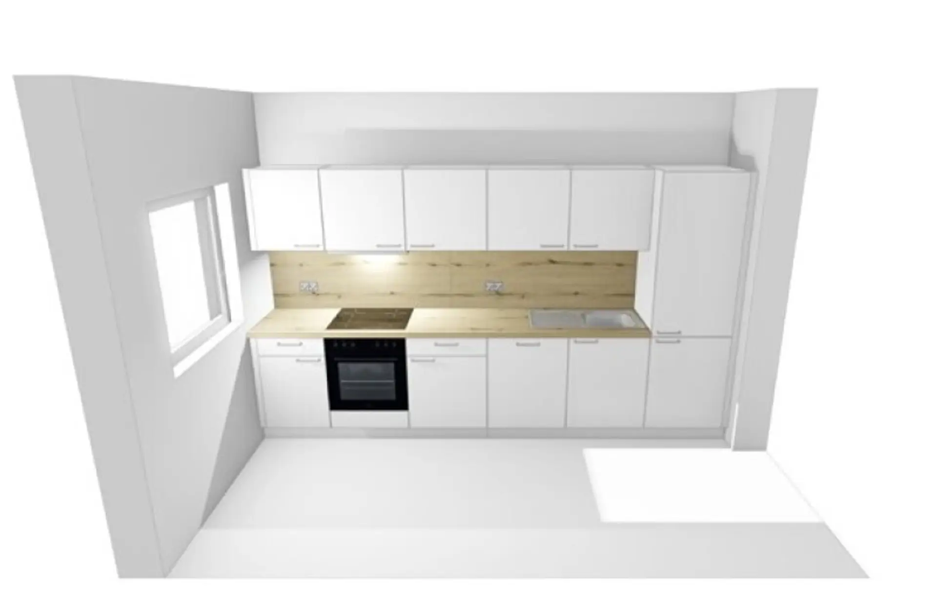 2-Zimmer-Wohnung mit großem Wohnbereich und neuer Einbauküche, Schlafzimmer mit eigenem Schrankraum, Badezimmer mit Badewanne, WC und Fenster.