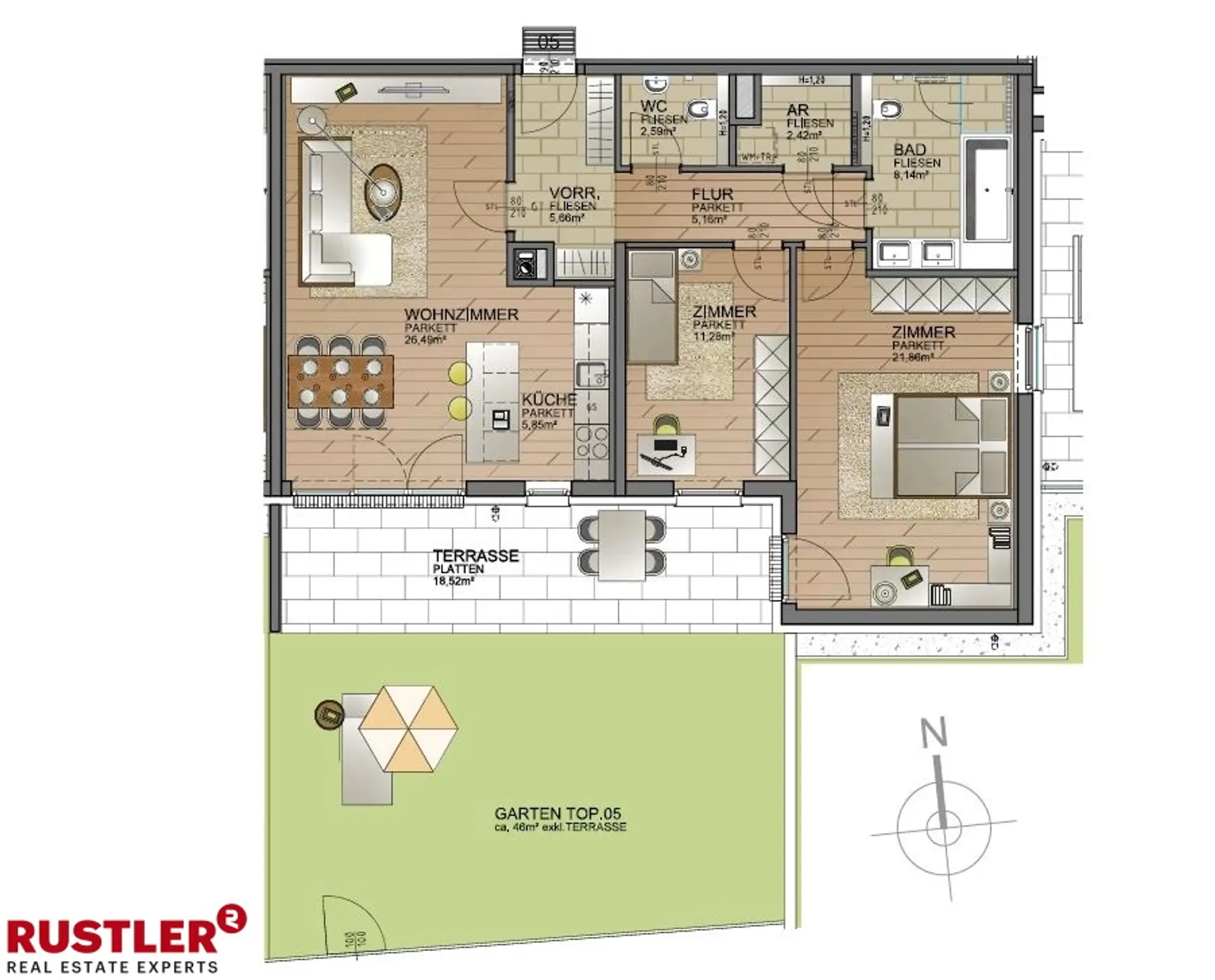 Die 3 Zimmerwohnung liegt im Erdgeschoß. Die Raumaufteilung ist wie folgt:
