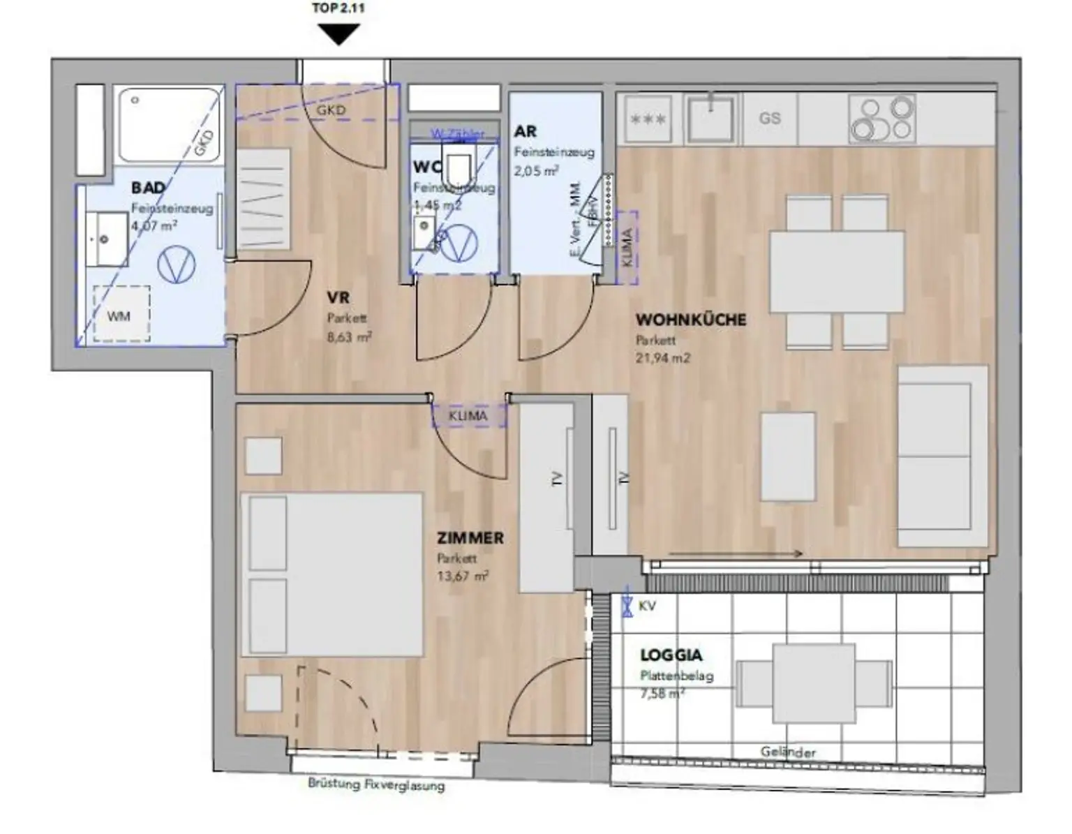 Ausstattung: Boden Bad Sauna Klimaanlage Fahrradraum Abstellraum Fußbodenheizung Loggia