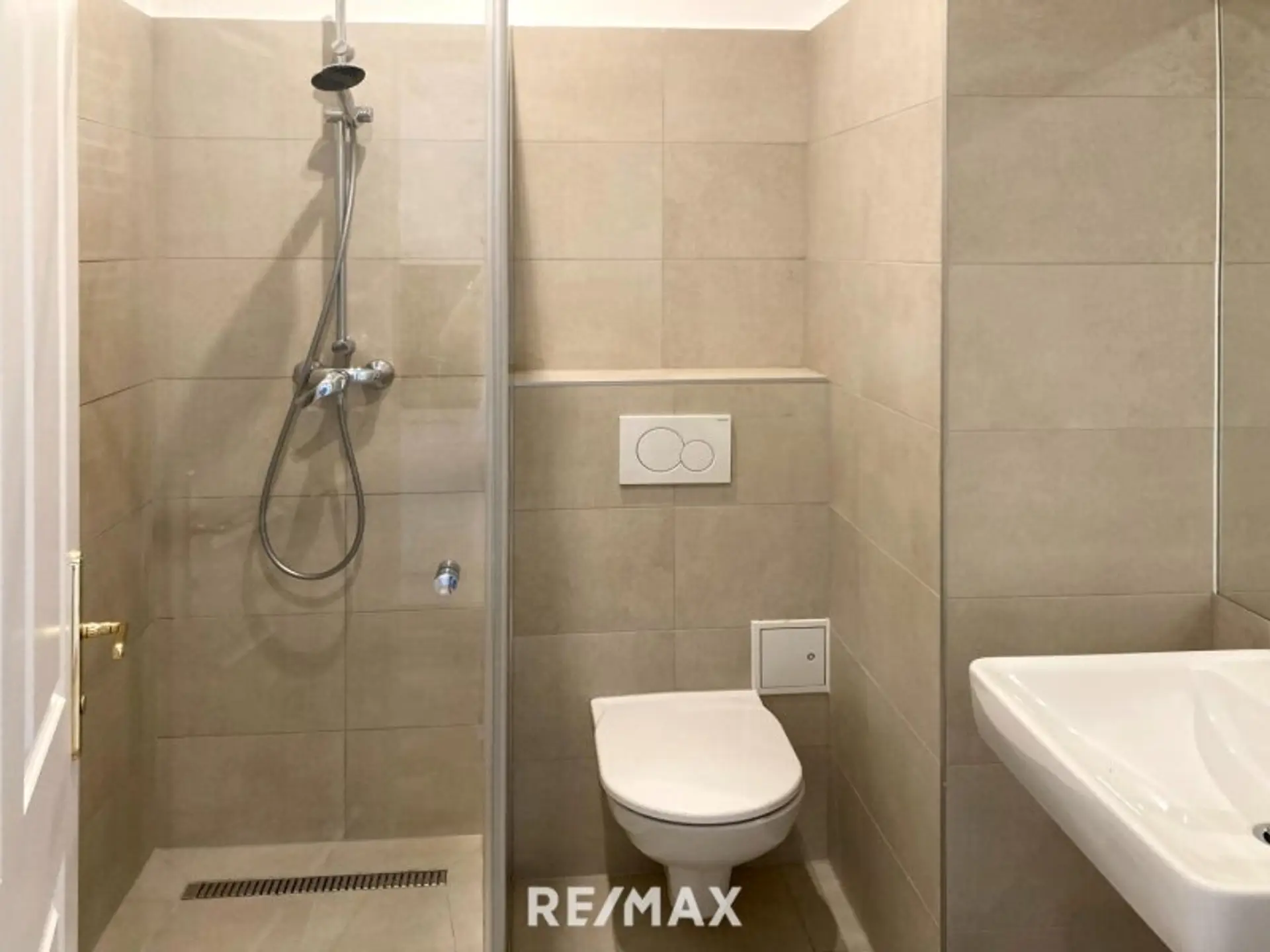 • Badezimmer: Das geflieste Duschbad verfügt über eine bodengleiche Dusche, ein WC und ein Waschbecken.