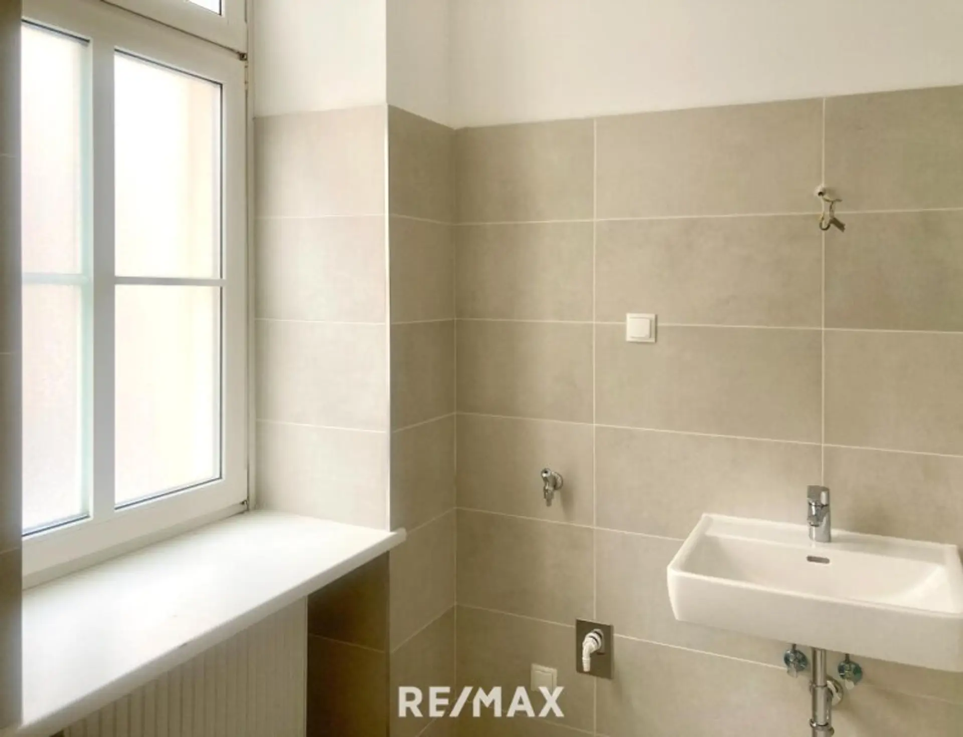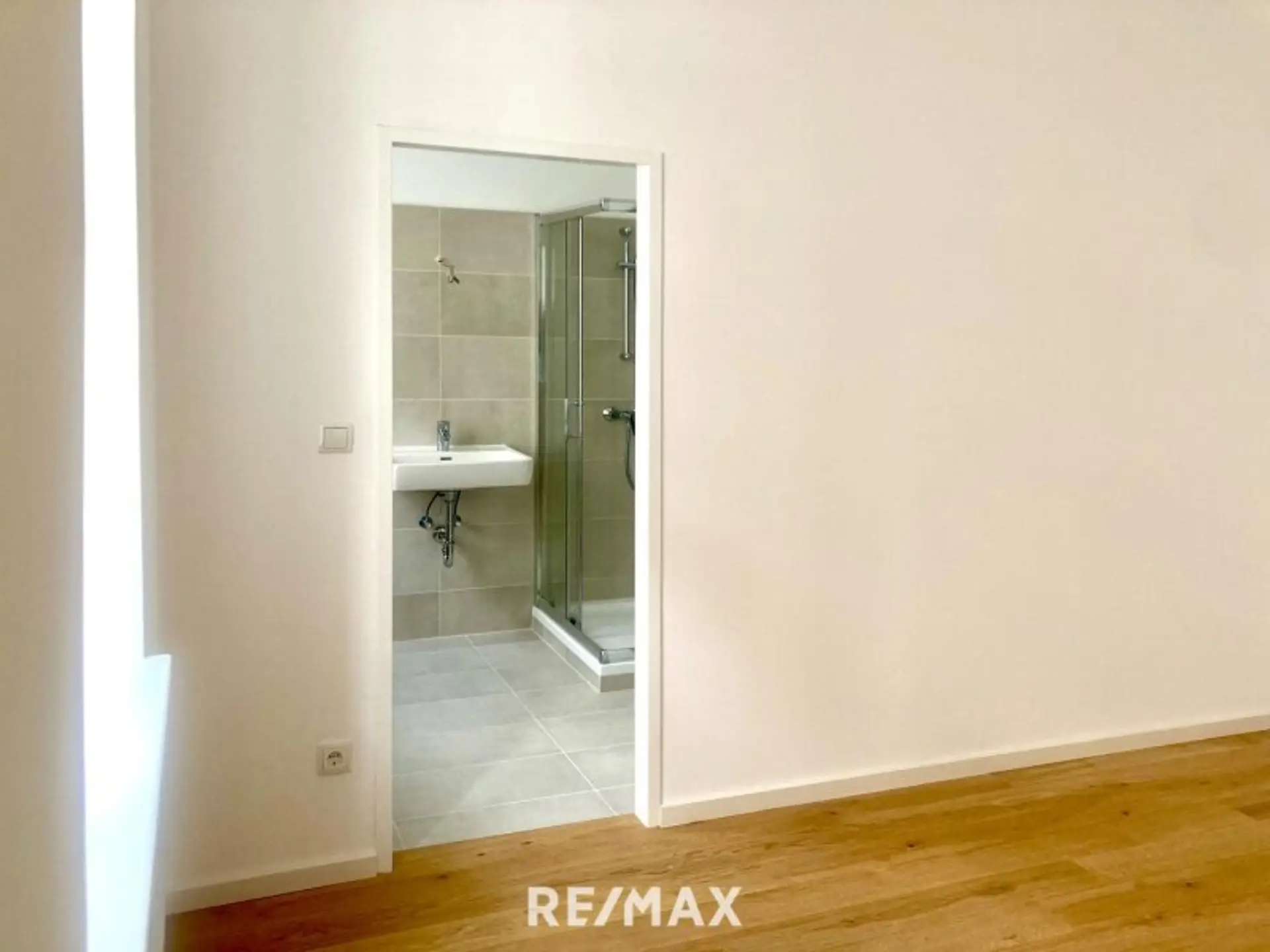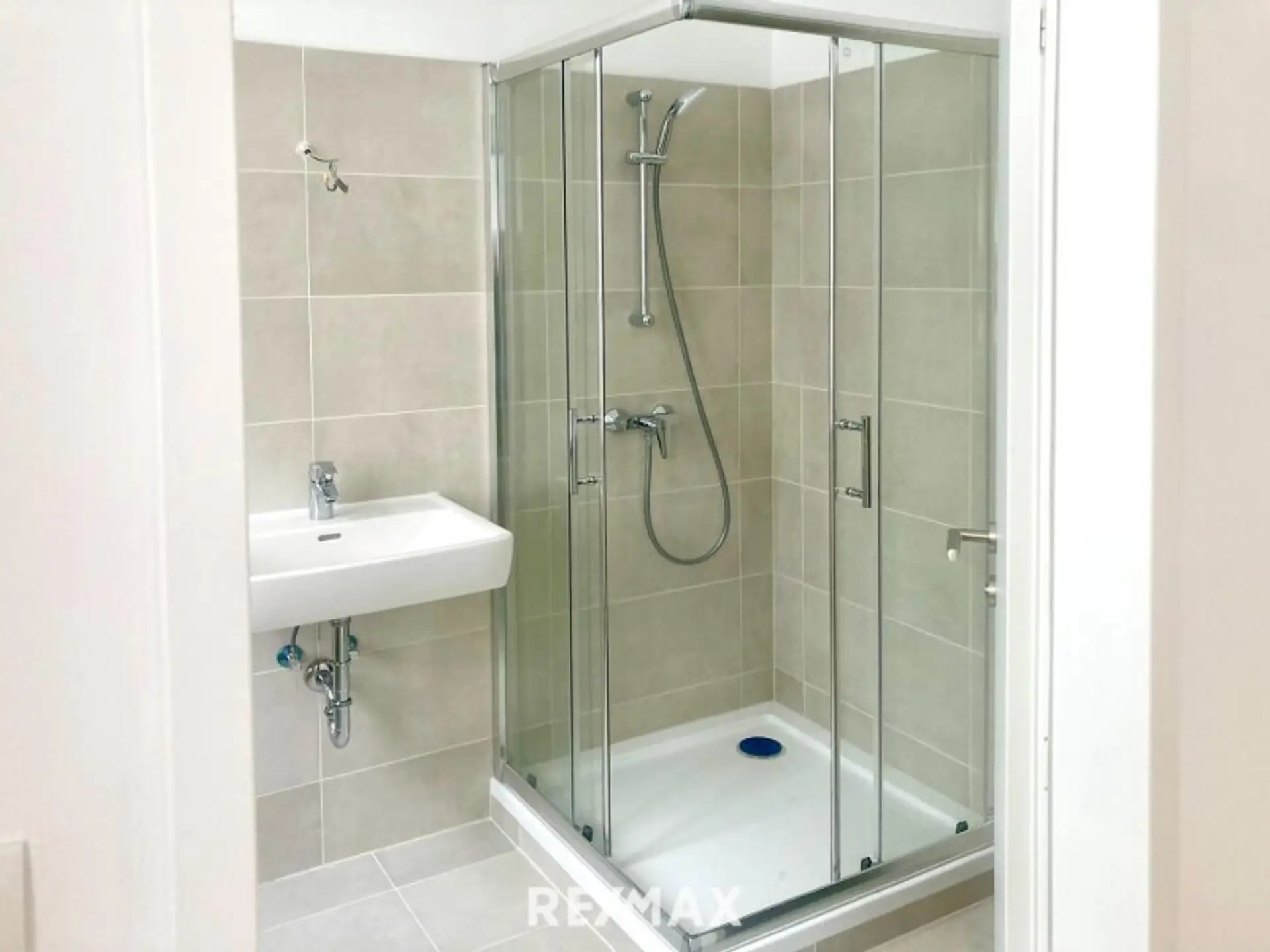 • Dusche: ca. 4,91 m² – Ein modernes Badezimmer mit einer geräumigen Dusche, Waschbecken und stilvollen Fliesen.