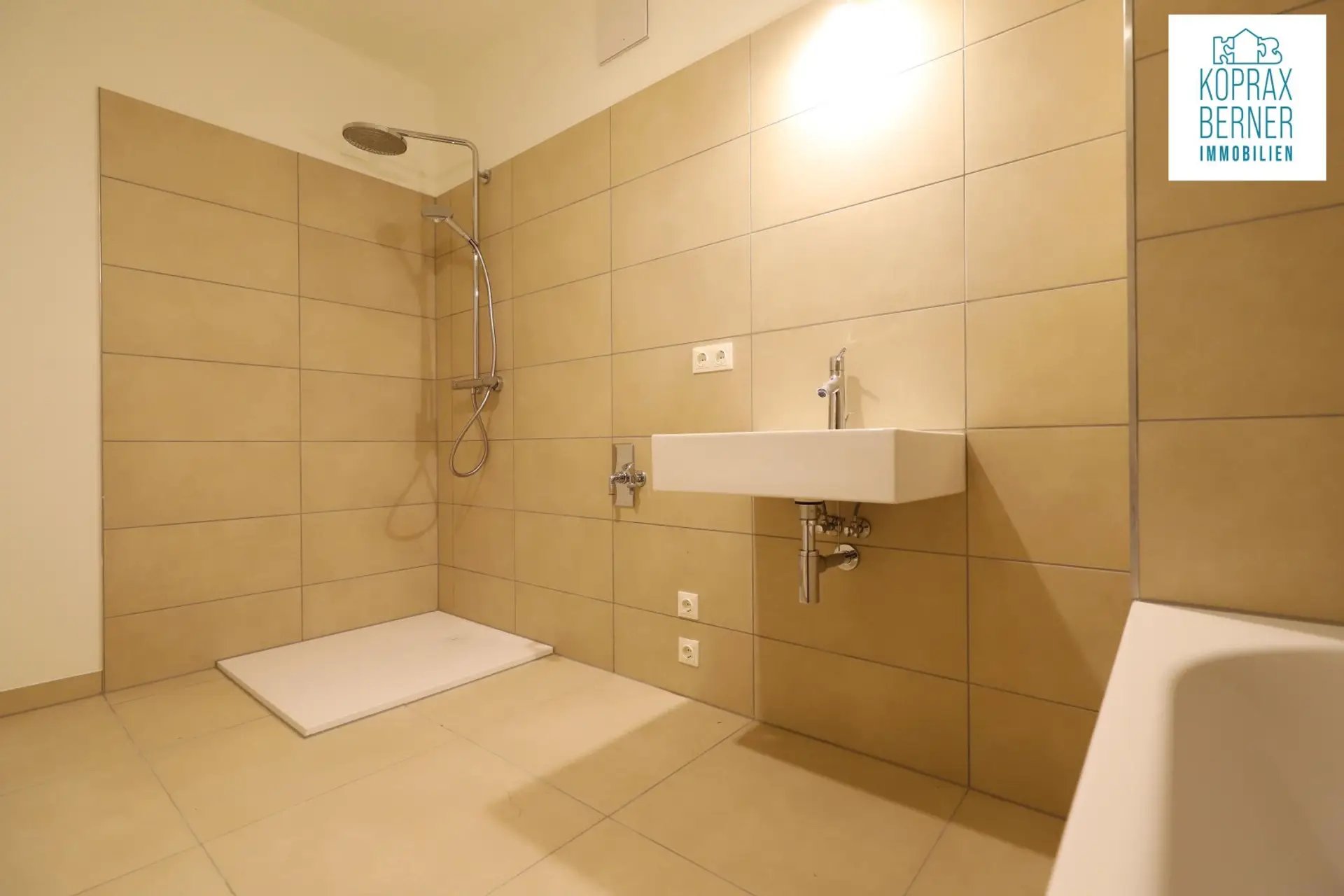 - Hochwertige Feinsteinzeug-Fliesen in Bad und WC.