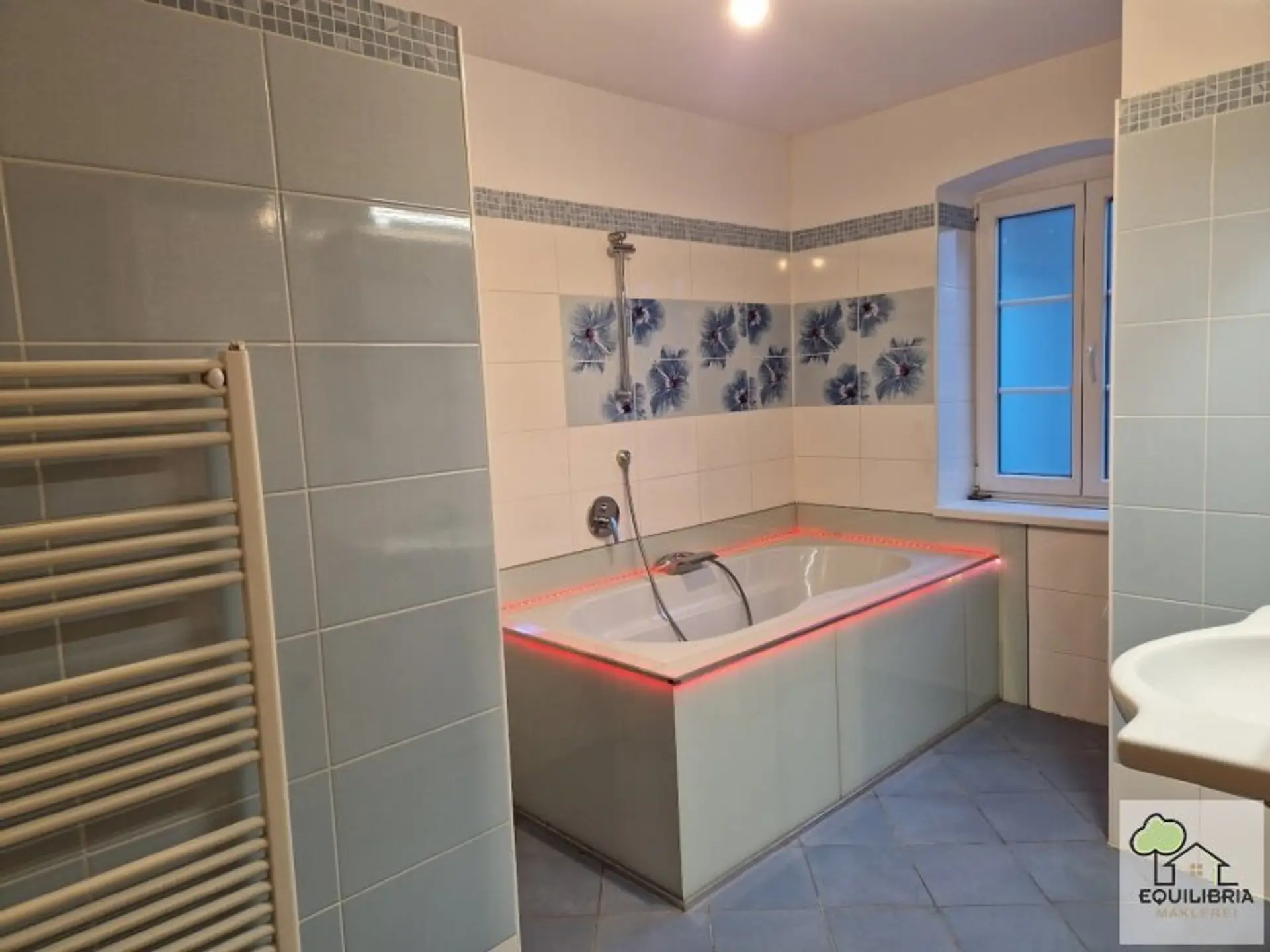 * Badezimmer mit Badewanne und Dusche und Waschmaschinenanschluss