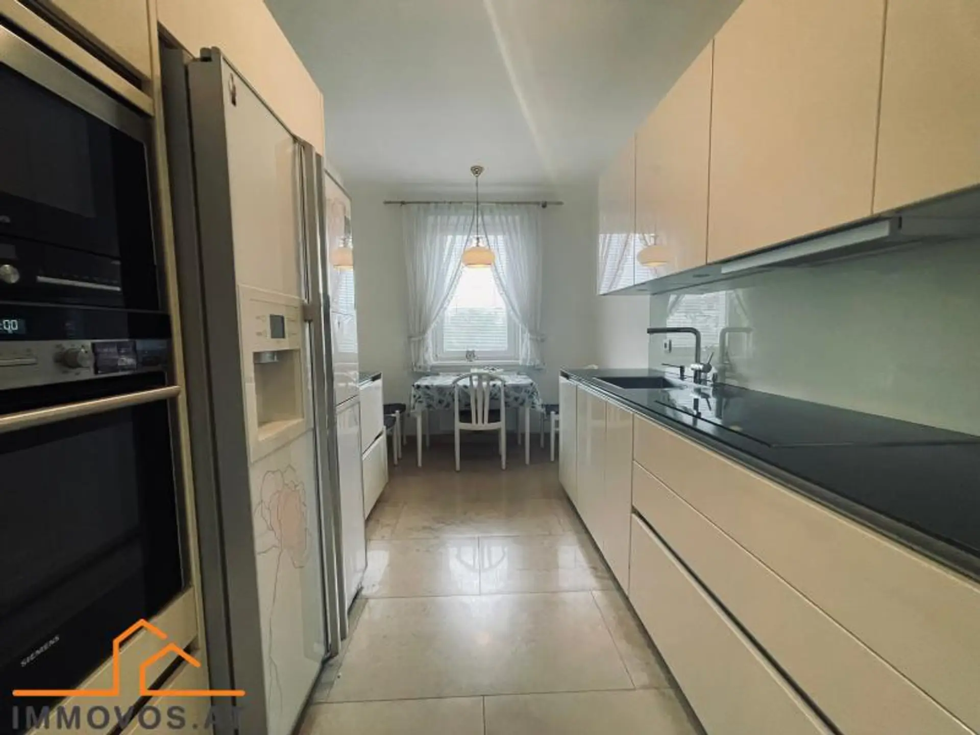 - -möblierte, moderne Küche möbliert mit Simatik-Möbel, mit kleinem Frühstückstisch (E-Herd, Backofen, Side-by-Side-Kühlschrank mit Svarovskisteinen, Geschirrspüler, Dunstabzug, Arbeitsplatte aus dunklem Stein)