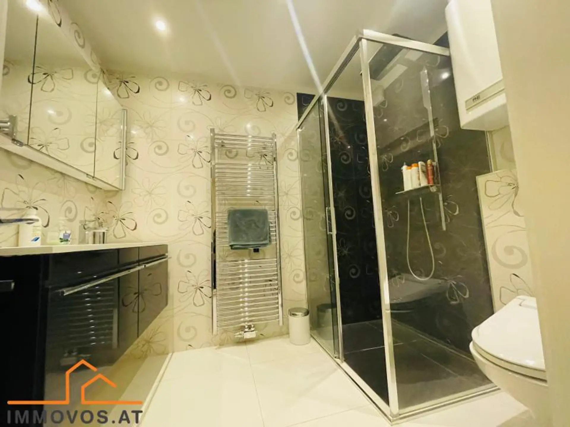 - Badezimmer mit Designerfliesen, Wasserfalldusche von Grohe, Badezimmermöbel von Joop, Toilette, Handtuchtrockner
