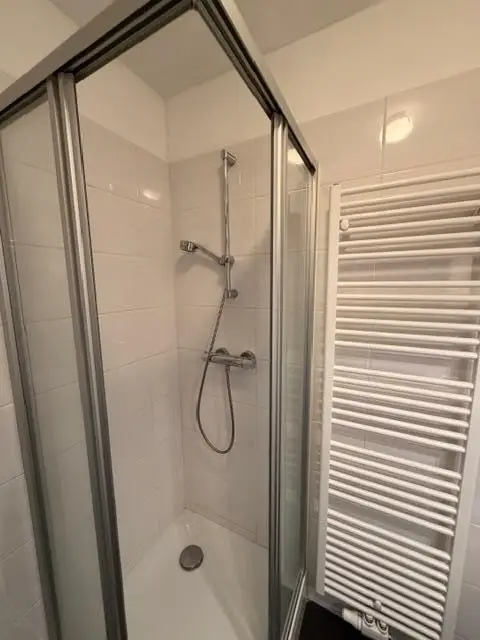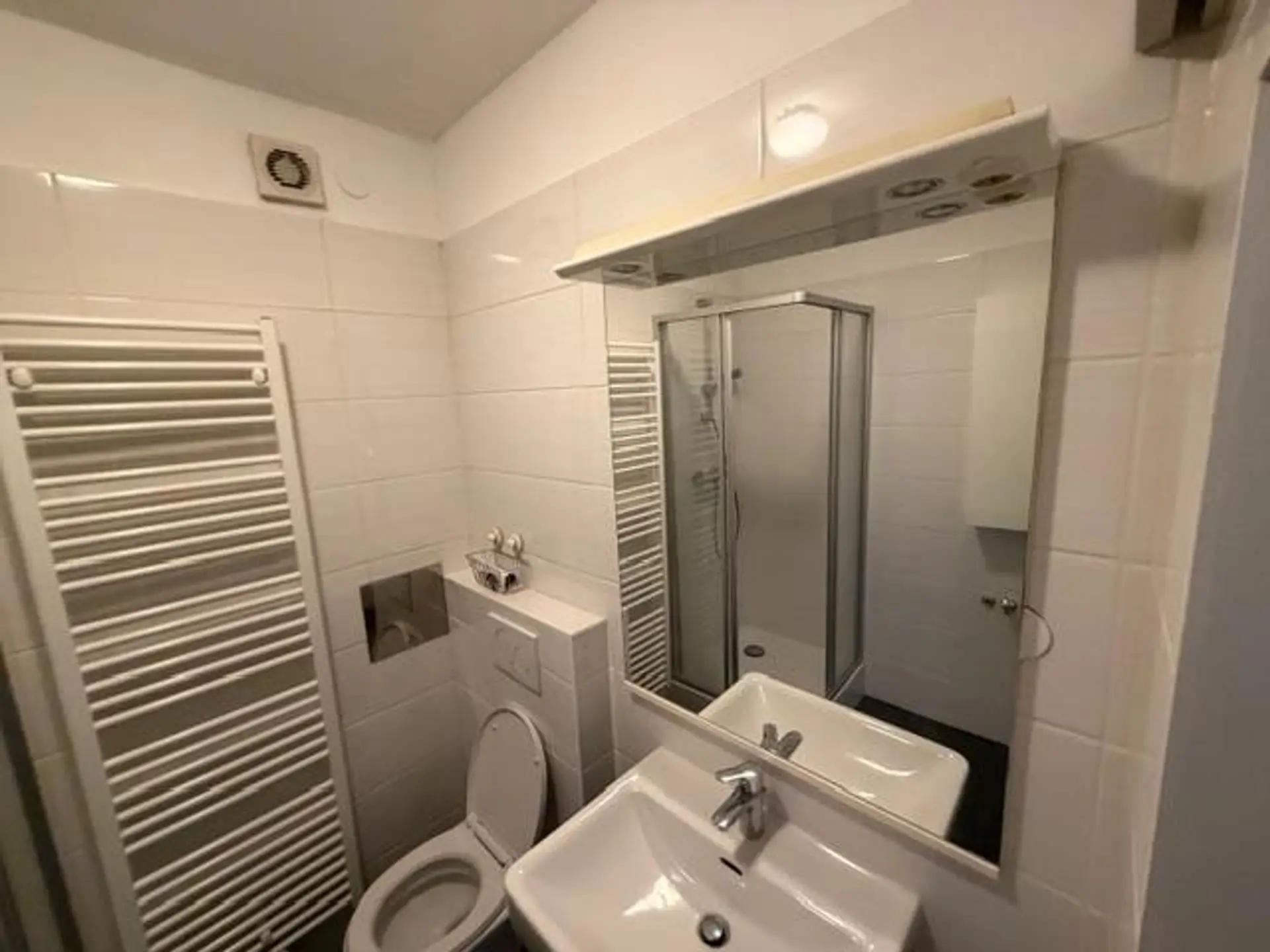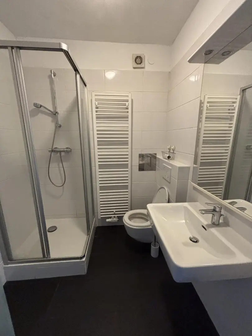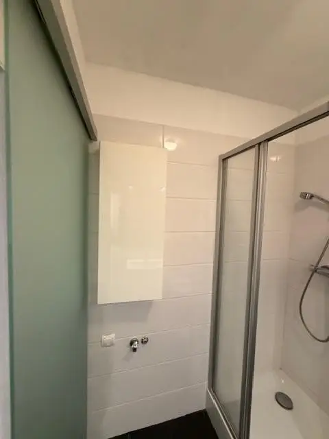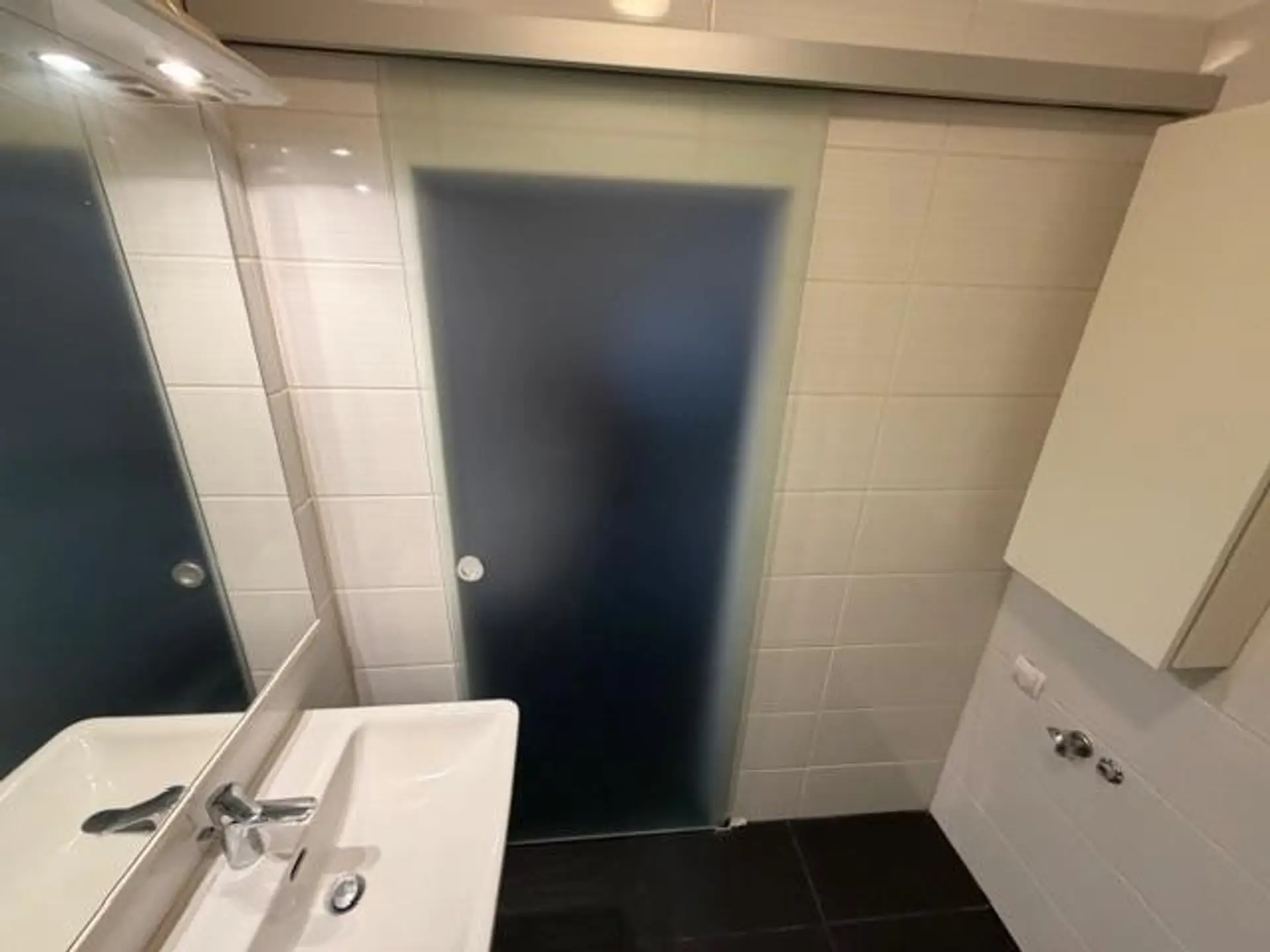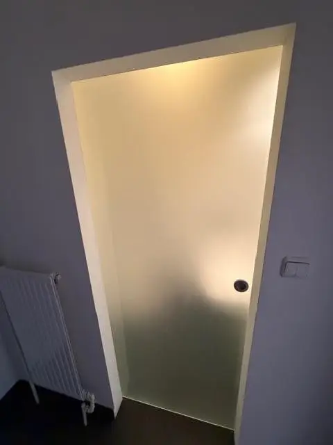 Links beim Eingang führt eine moderne Glasschiebetür ins Badezimmer mit