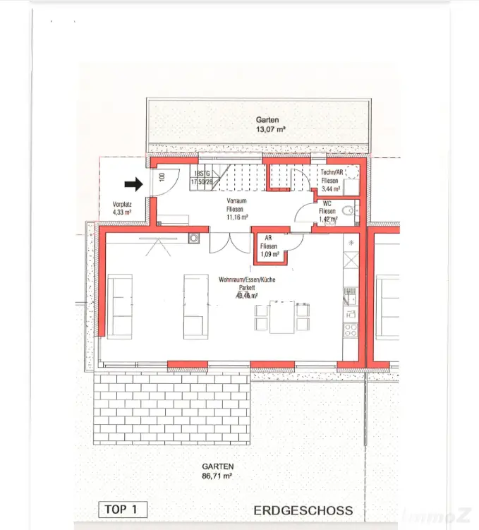 EG: offener Wohn-Essbereich-Küche, Vorraum, WC, Technikraum und Abstellraum