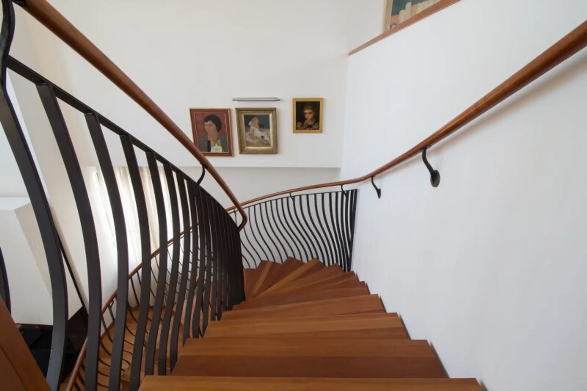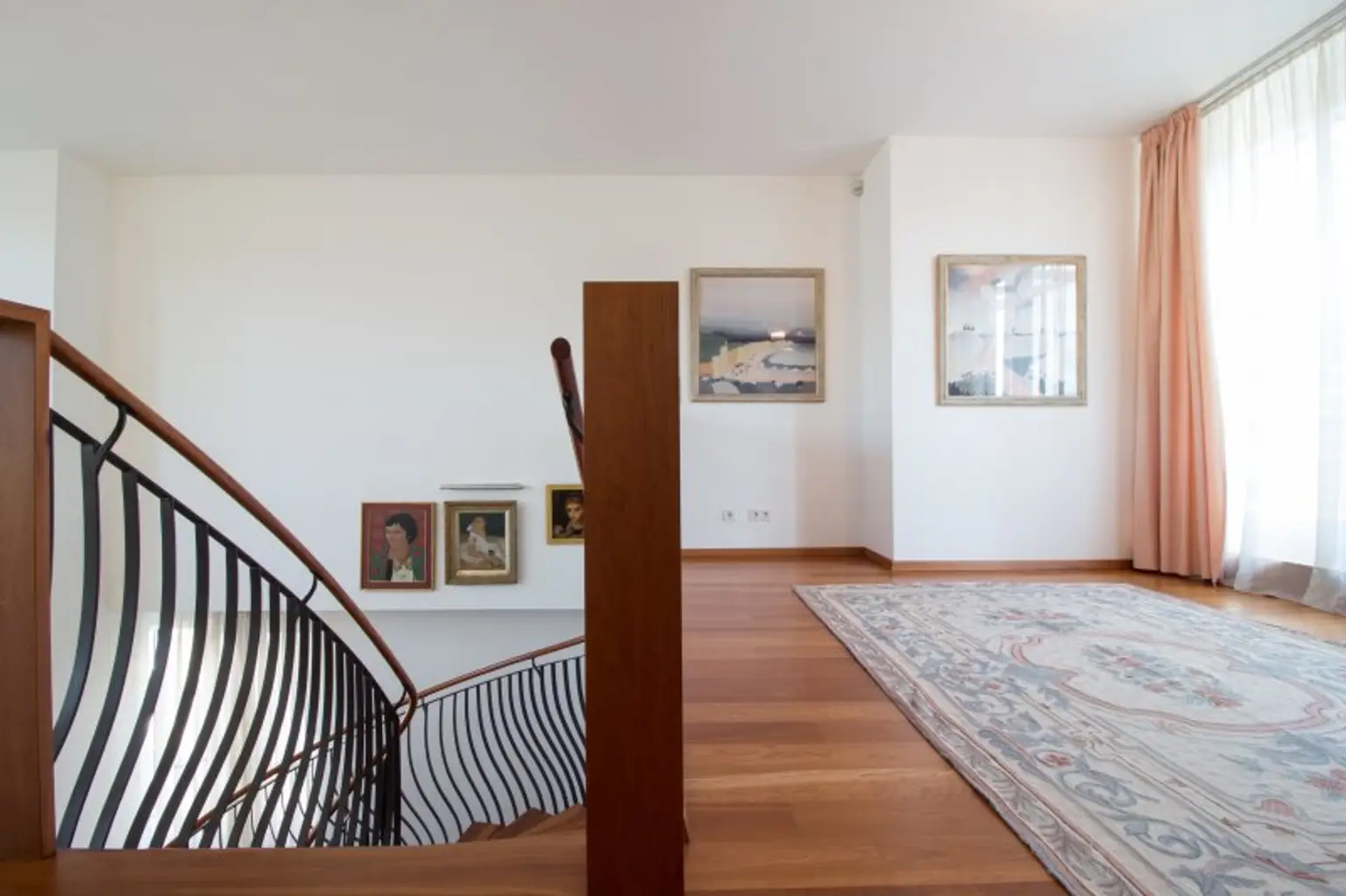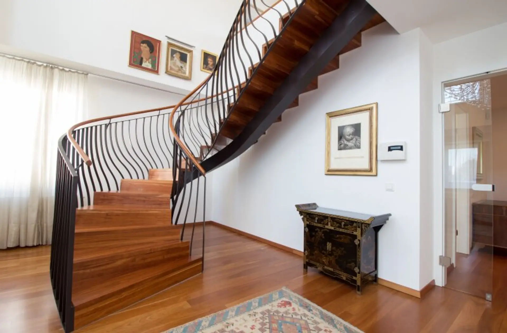 Zur oberen Wohnebene gelangt man über die Designer Kirschholztreppe, welche in mühevoller und detailverliebter Handarbeit hergestellt wurde.