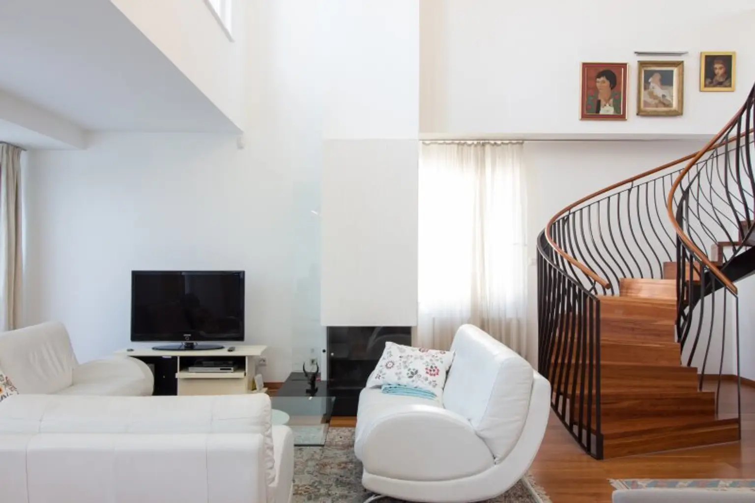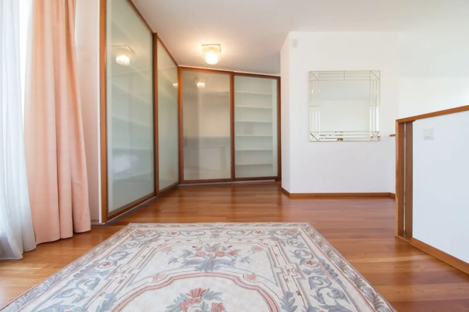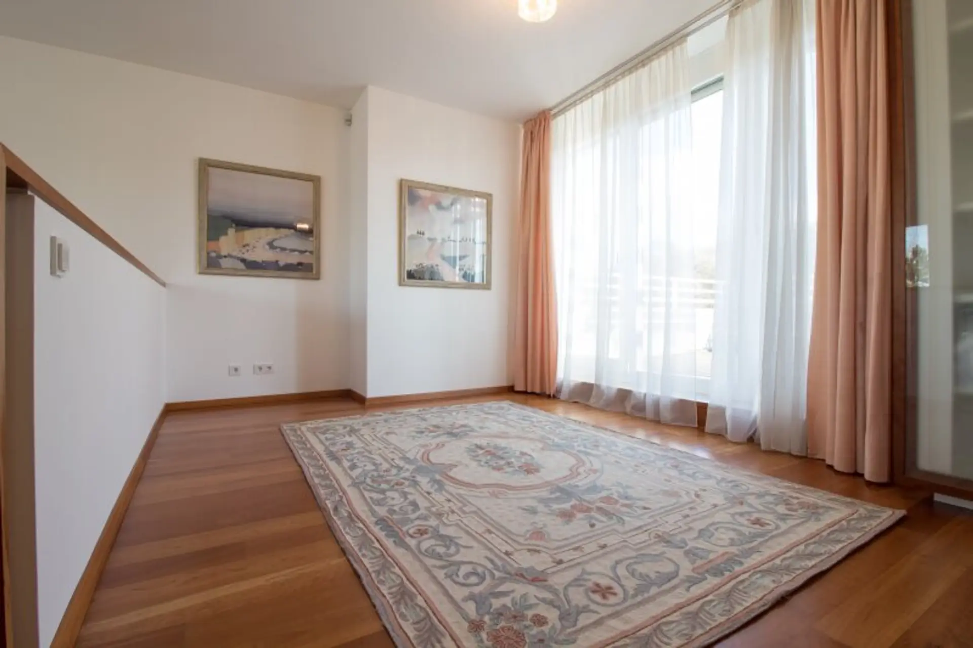 Zur oberen Wohnebene gelangt man über die Designer Kirschholztreppe, welche in mühevoller und detailverliebter Handarbeit hergestellt wurde.