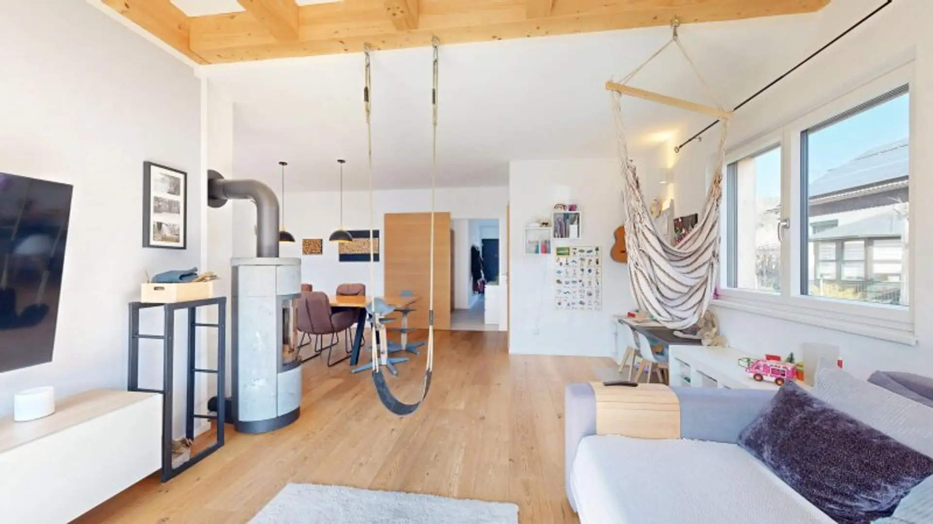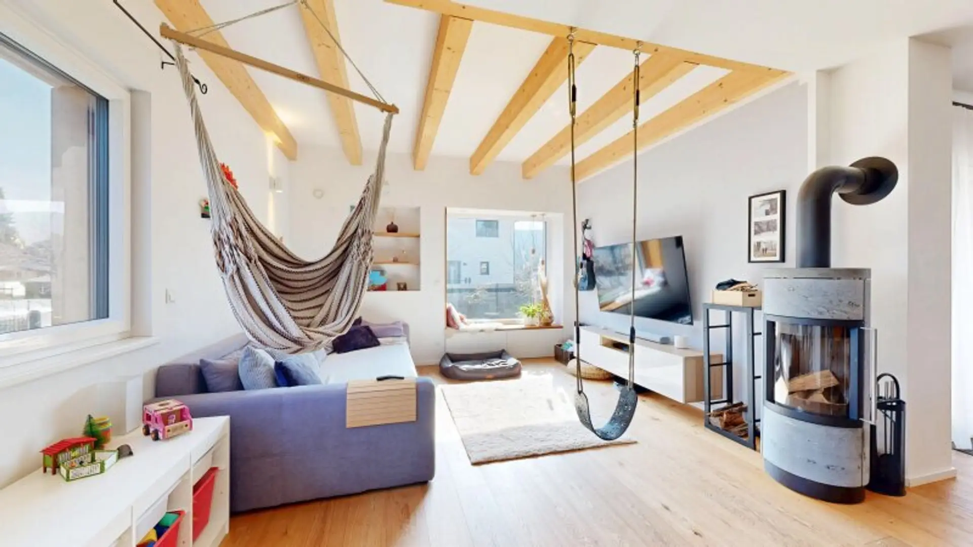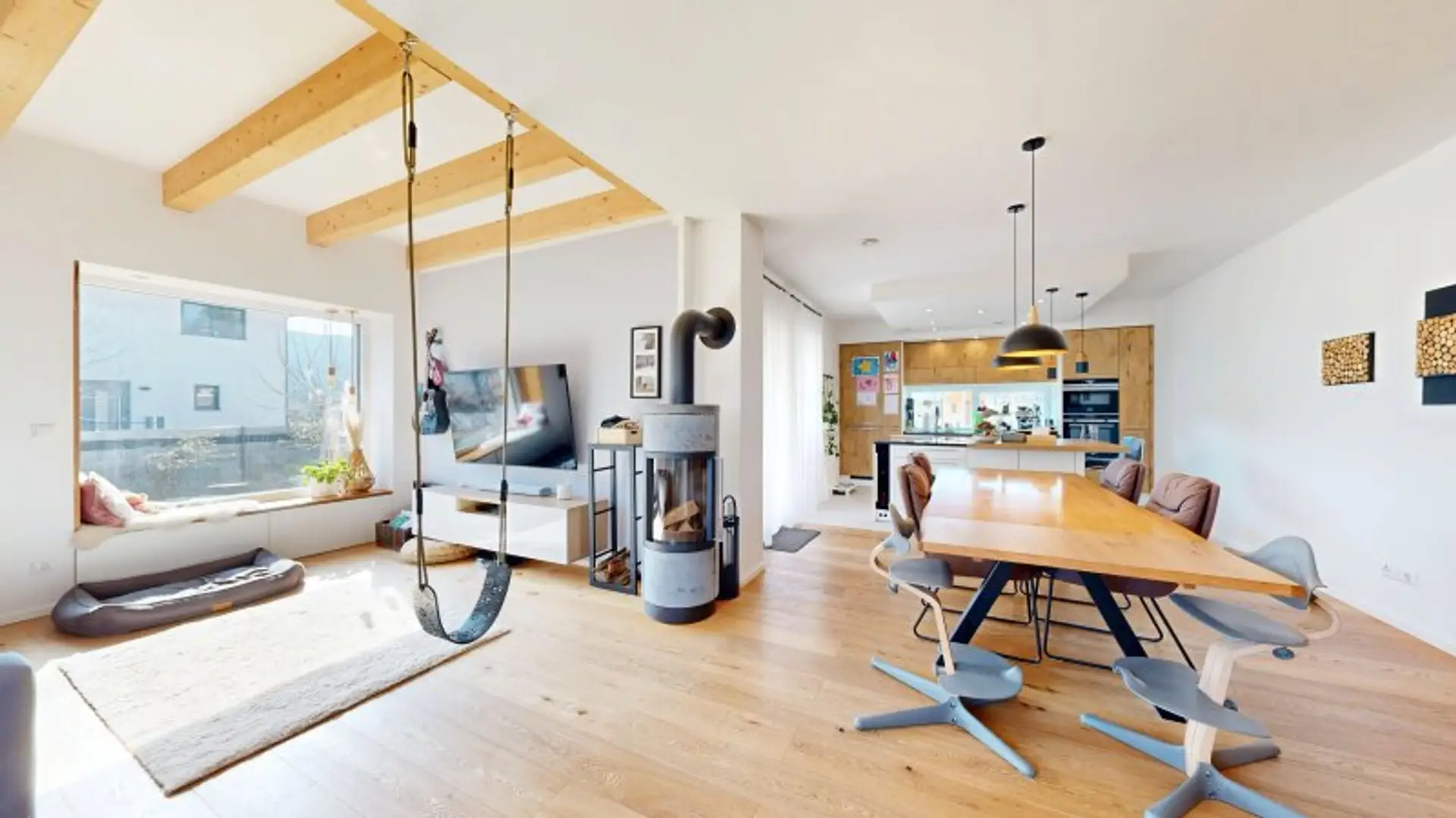 * Wohnzimmer mit Kaminofen mit Drehfunktion und Panoramafenster mit Sitzmöglichkeit