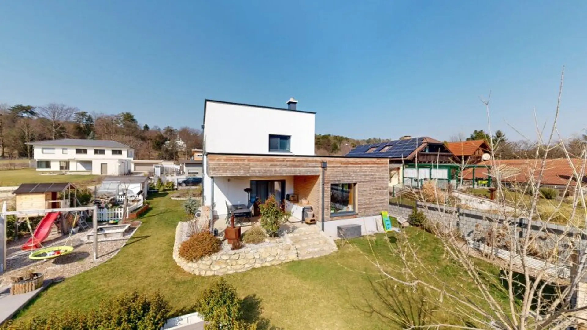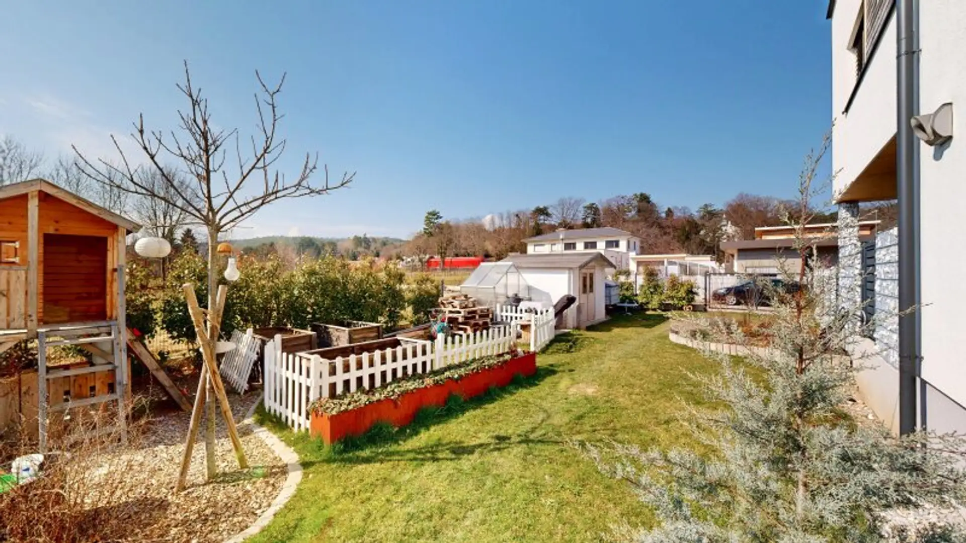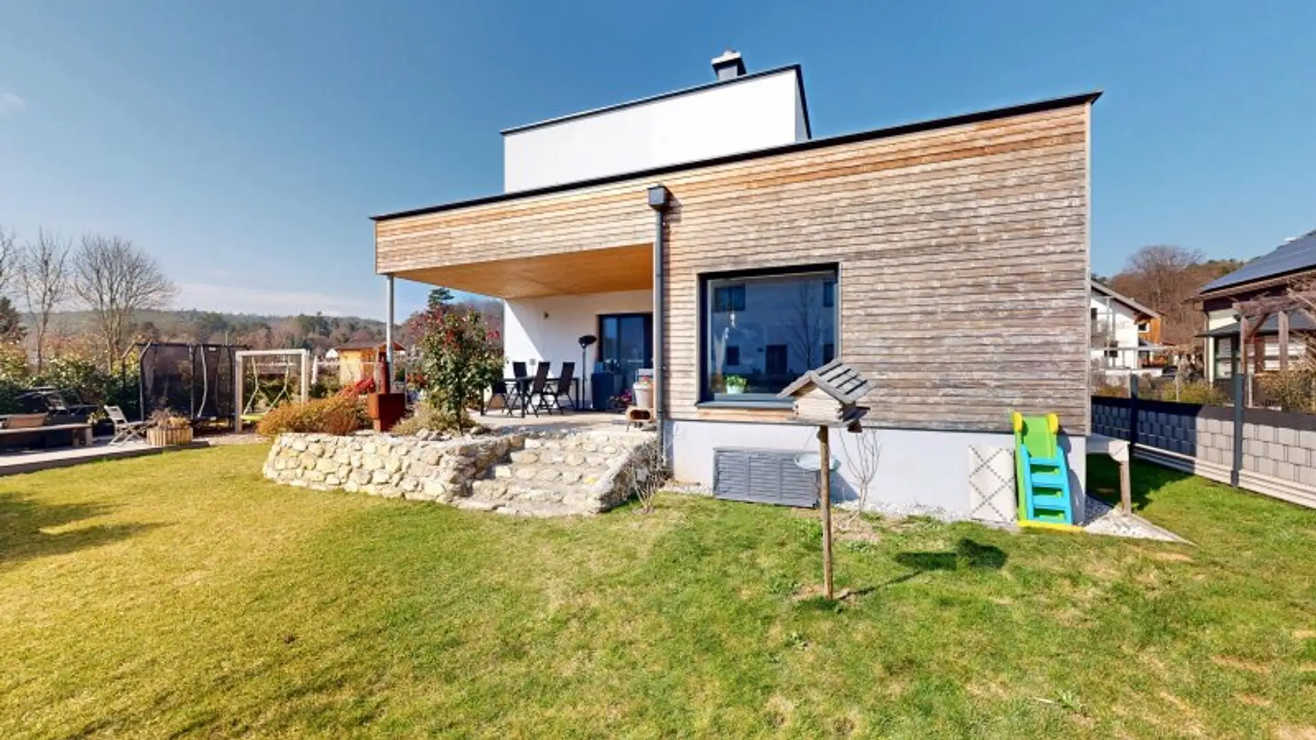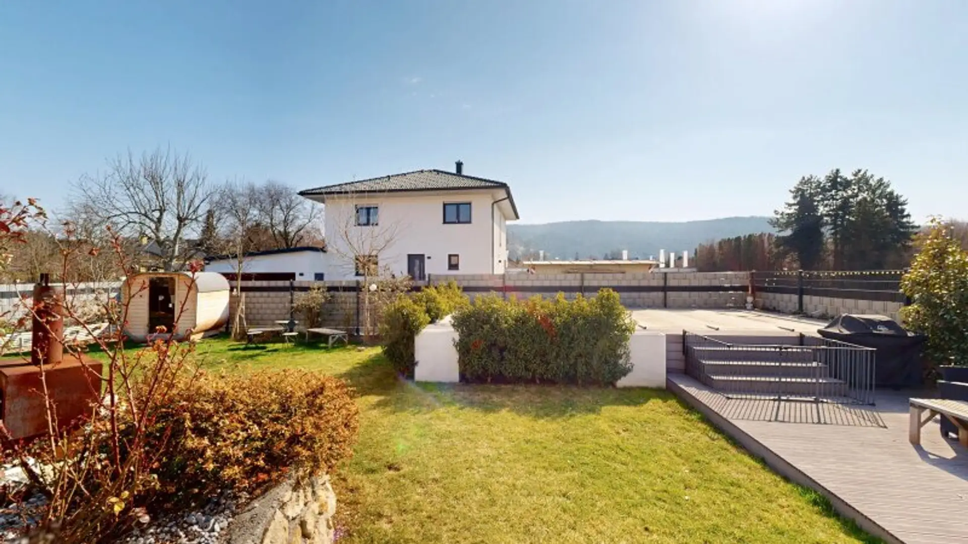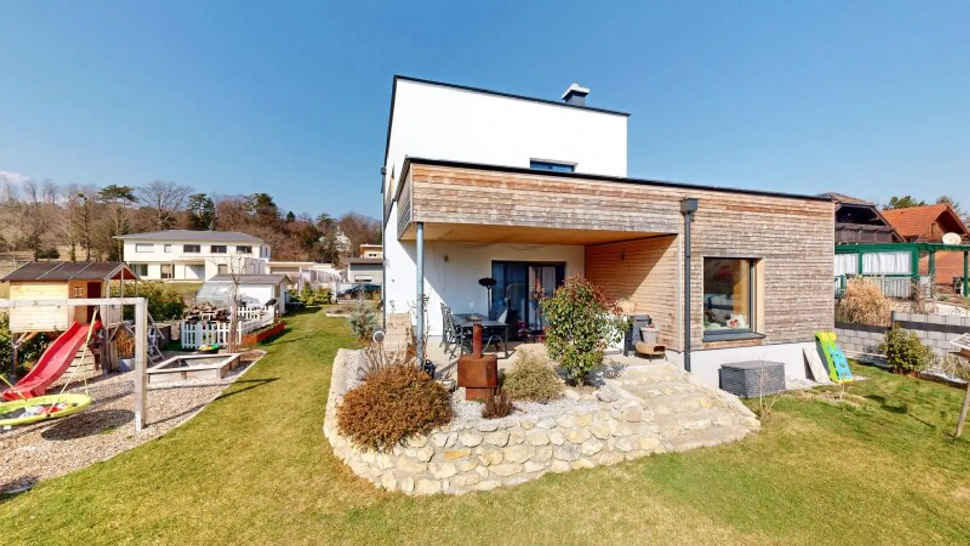 Der außergewöhnlich schöne, komplett angelegte Außenbereich bietet alles, was das Herz begehrt: eine an das Esszimmer angeschlossene, überdachte Terrasse, einen Lounge-Bereich neben dem Pool, eine Sauna-Kabine und nicht zuletzt, ein kleines Kinder-Spielparadies.