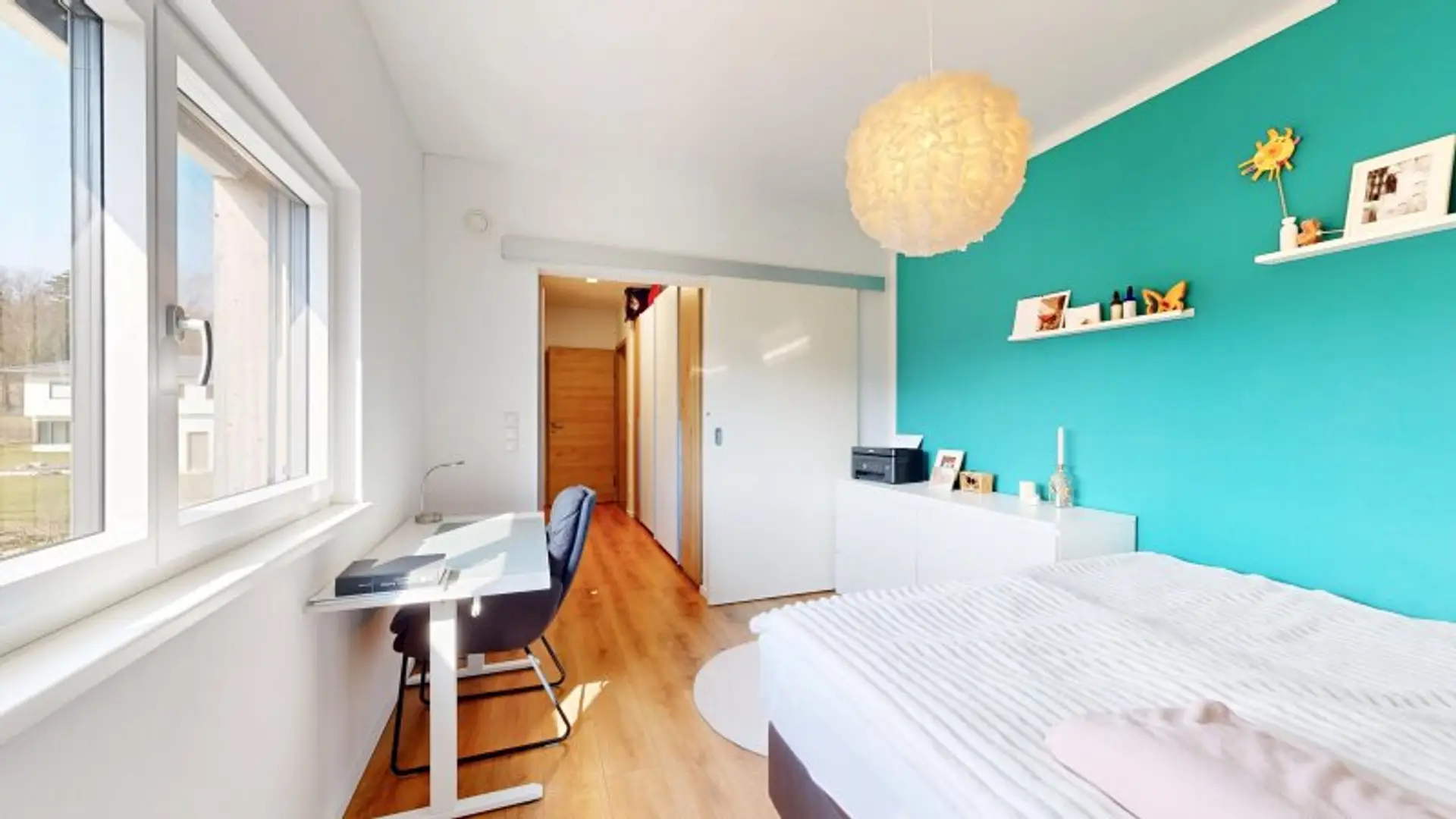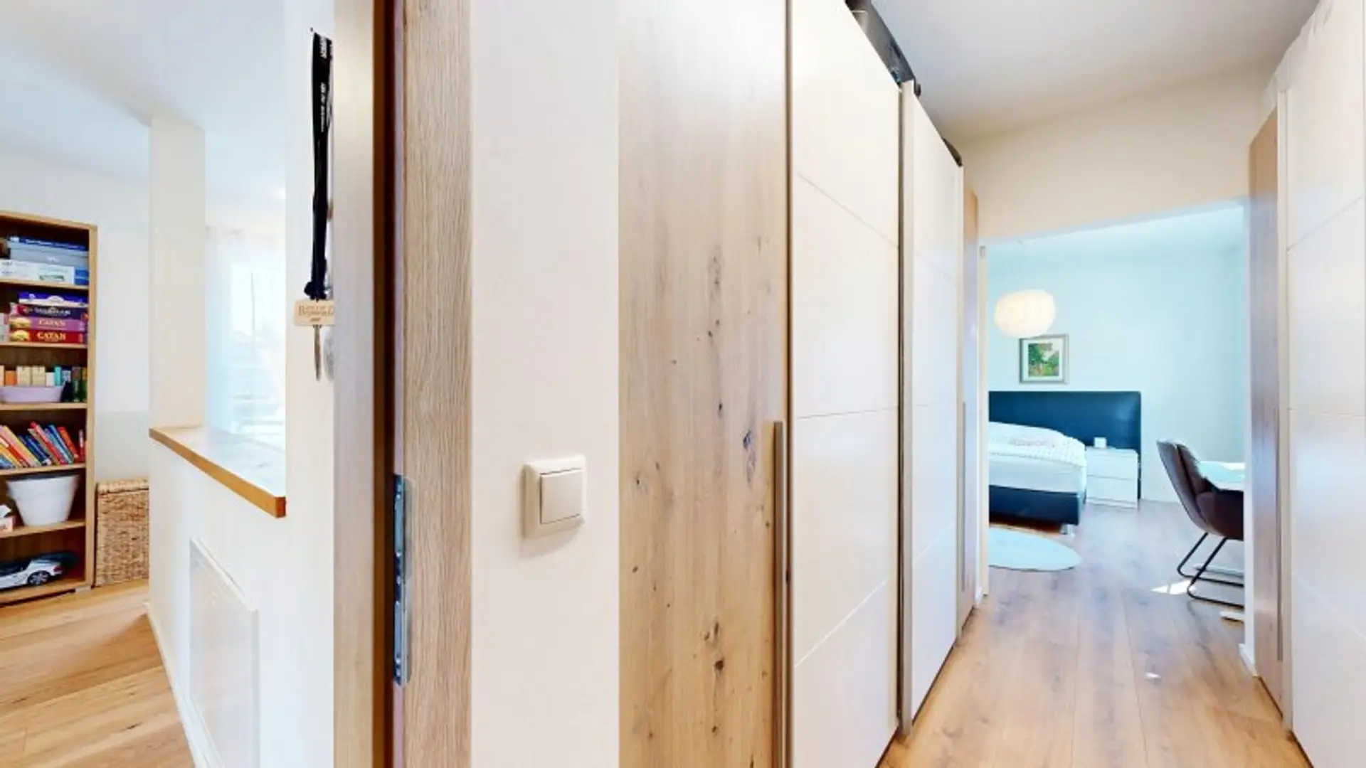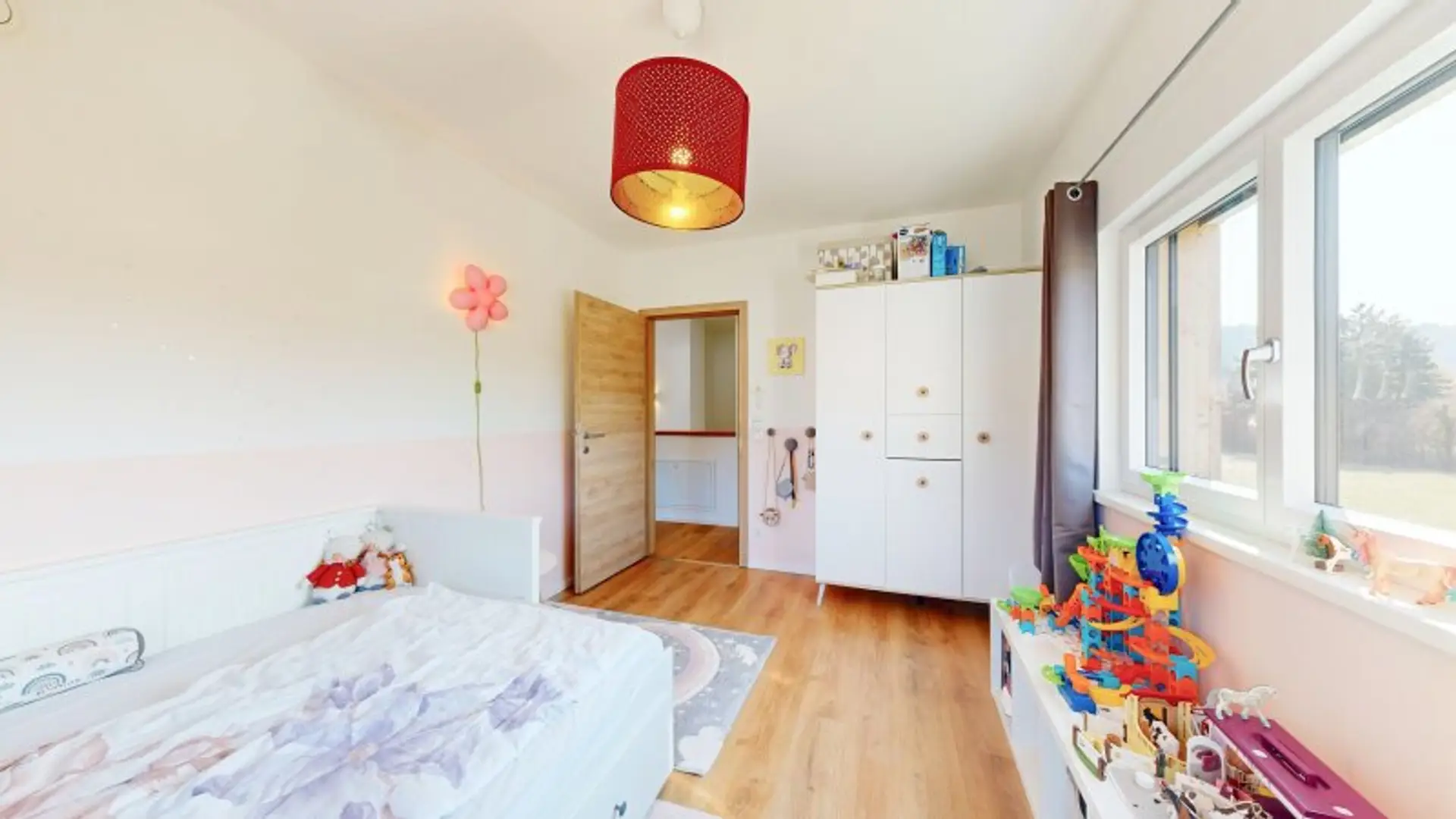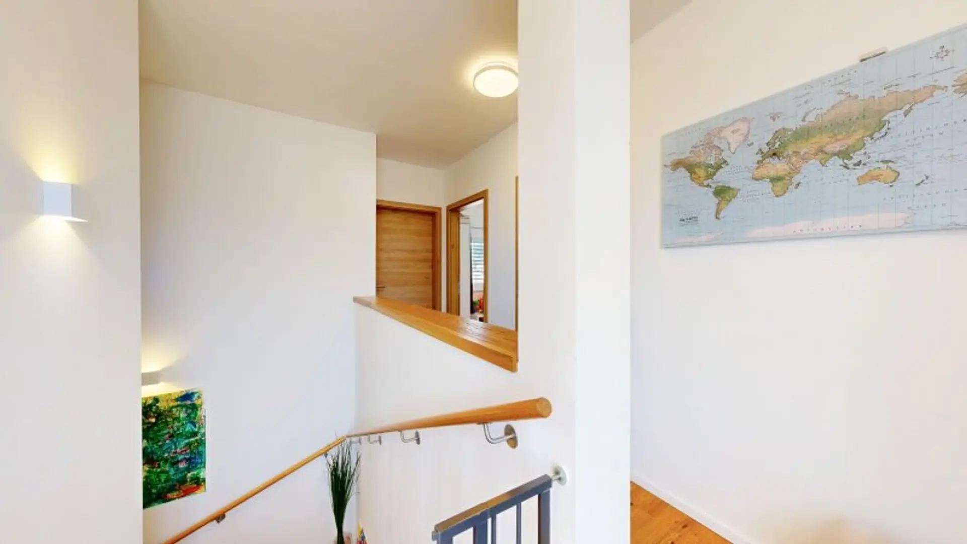 Im oberen Geschoss befinden sich drei Schlafzimmer (eines davon mit eigenem Schrankraum), sowie eine Toilette und ein großes Tageslicht-Badezimmer mit Doppelwaschbecken, Badewanne und Dusche.