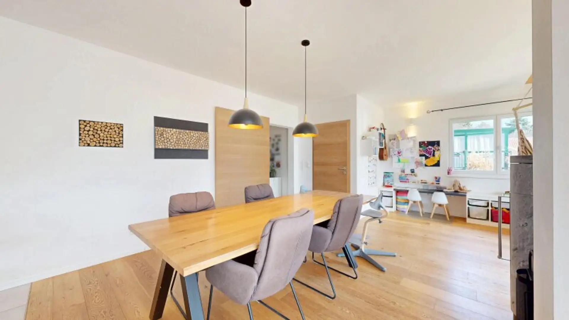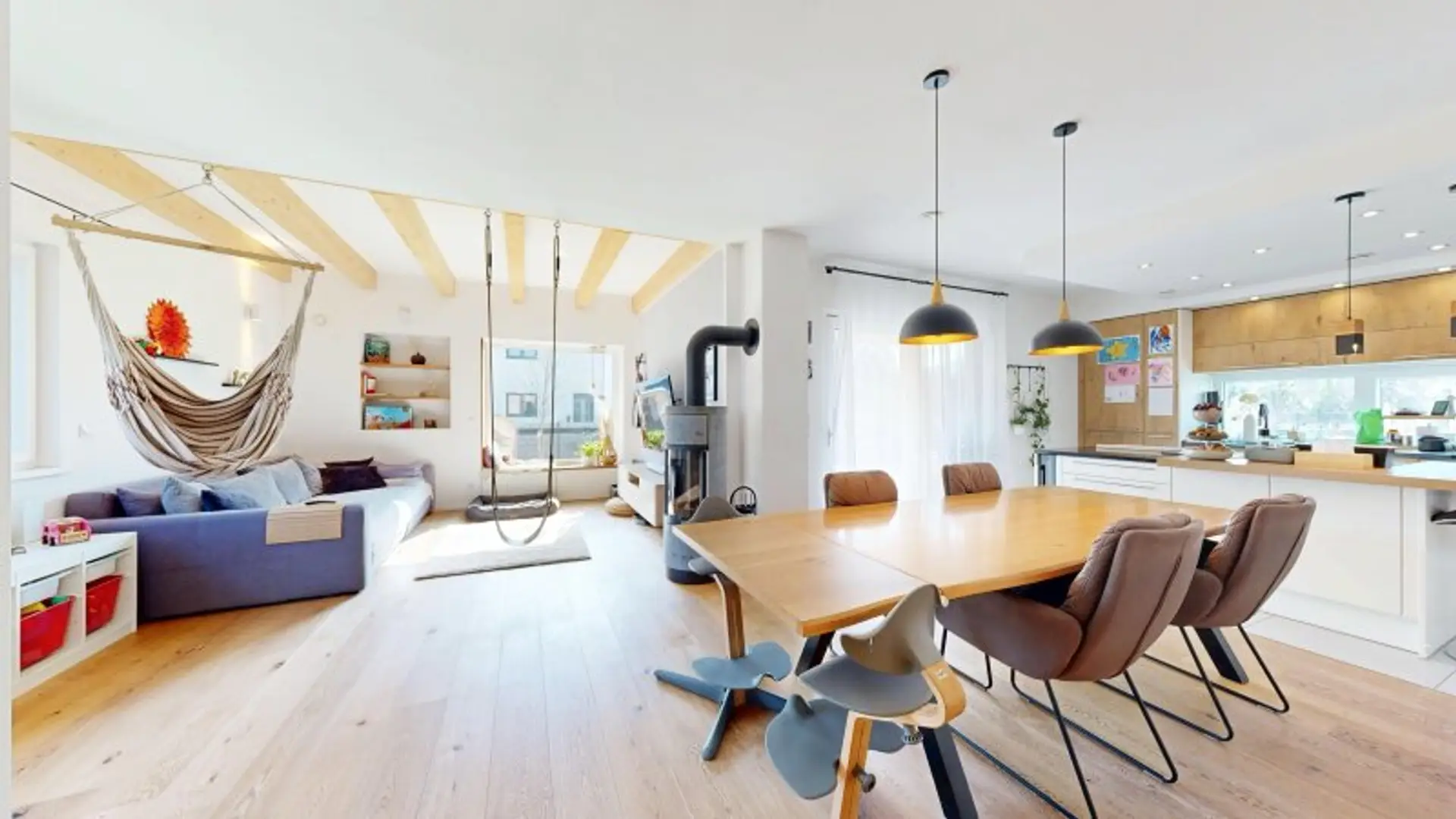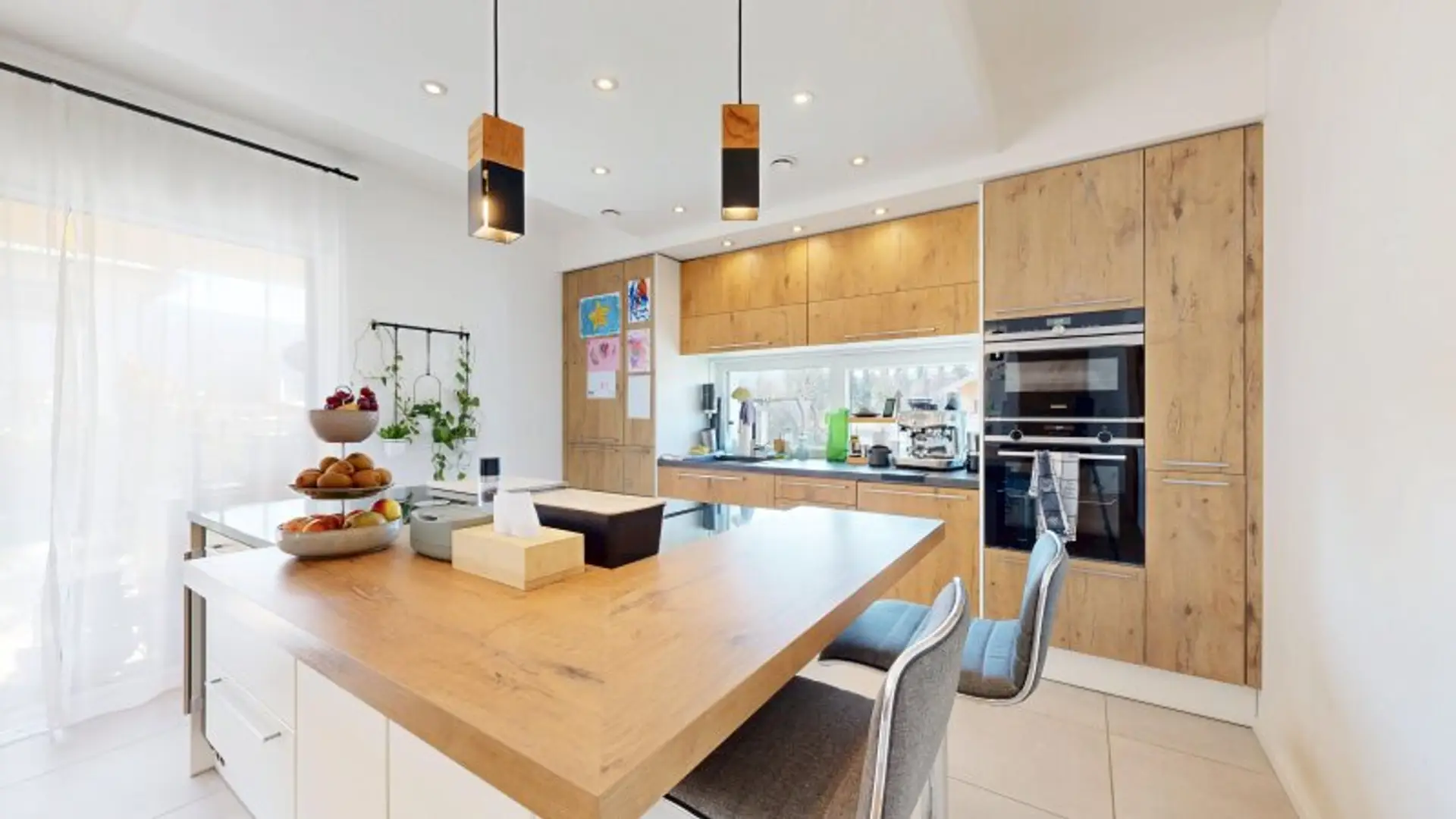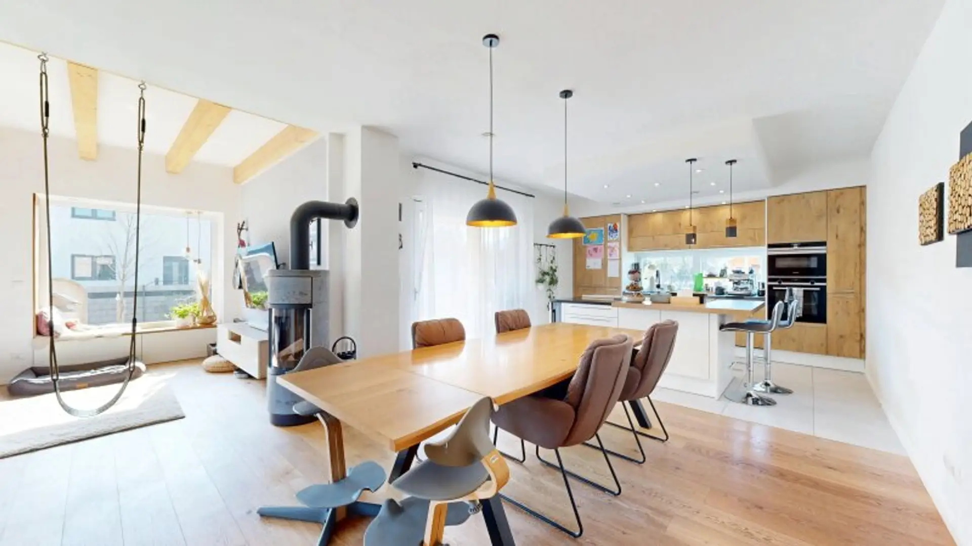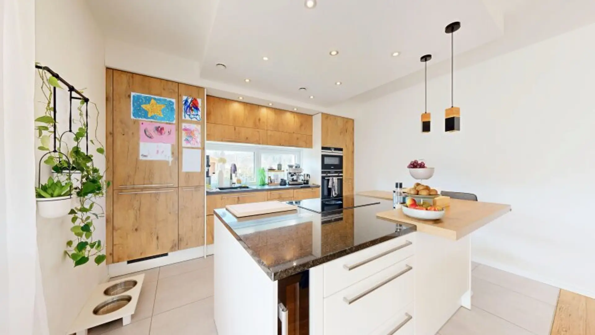 Das Wohnhaus weist eine Fläche von ca. 147m² verteilt auf zwei Ebenen auf und bietet viel Raum zum Leben. An das einladende Foyer schließen ein gut bemessener Technik- und Hauswirtschaftsraum, eine separate (Gäste-) Toilette und schließlich das Herzstück des Hauses - der großzügige und repräsentative Wohn-/Essbereich, der über einen Zugang zur überdachten, gemütlichen Terrasse verfügt, die zum Entspannen und Verweilen einlädt. Hier findet sich außerdem die schicke, hochwertige und voll ausgestattete Küche mit großer Kochinsel. Im gemütlichen Wohnbereich sorgt der extravagante Ofen für ein besonders gemütliches Ambiente, das Panoramafensters präsentiert einen traumhaften Blick in den liebevoll angelegten Garten.