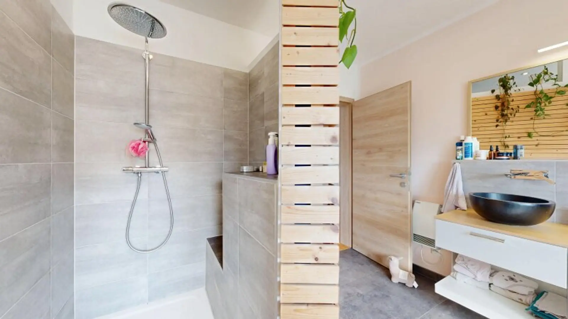 * Großes Tageslicht-Badezimmer mit Dusche, Badewanne und Doppelwaschbecken