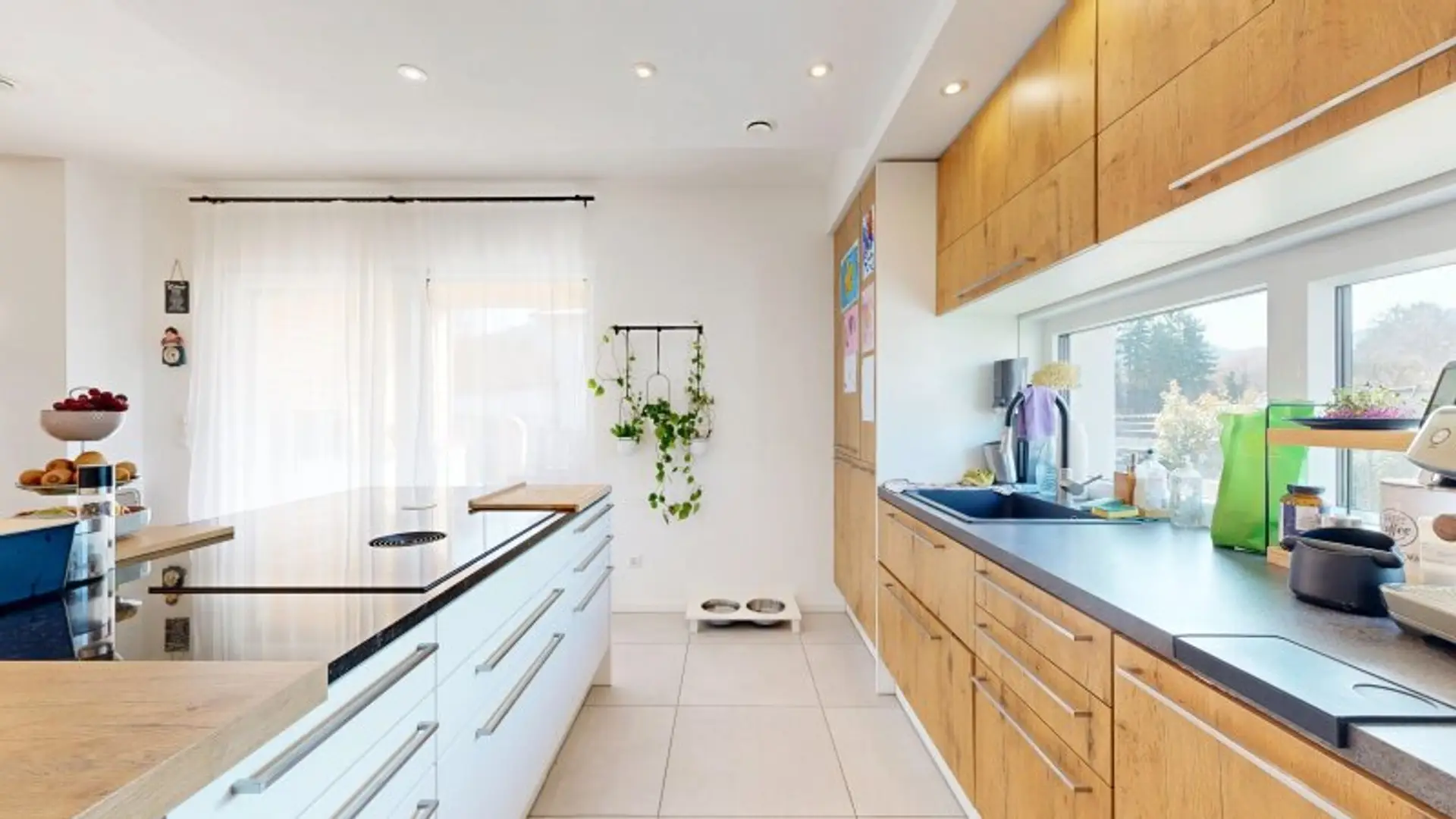 * Moderne, offene Küche voll ausgestattet mit z.B. Kombidampfbackofen, sowie mit Kochinsel mit Granitsteinplatte und Weinkühler