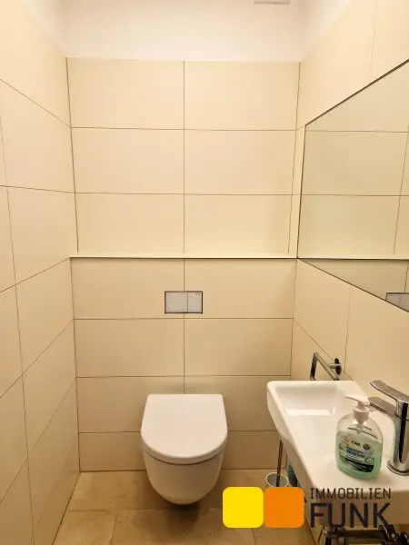 Sie betreten diese überaus attraktive Immobilie über den Vorgarten und den offenen Vorraumbereich, der ausreichend Platz für die Garderobe bietet. Rechter Hand stehen der Haustechnikraum, ein WC mit Handwaschbecken sowie zwei große Abstellräume und eine zusätzliche, begehbare Garderobe zur Verfügung. Das restliche Erdgeschoss verwöhnt mit seiner offenen Grundrissgestaltung: auf etwa 73 m² präsentiert sich ein -durch die großen Fensterflächen- überaus heller Lebensraum mit Küche, Wohnzimmer und Wintergarten. Dieser Bereich öffnet sich zum ebenen und liebevoll gestalteten Garten. Sowohl aus dem Wohnbereich als auch aus dem Wintergarten betreten Sie jeweils auf eine große Terrasse. Jene vor dem Wohnzimmer verfügt zusätzlich über eine neue Markise.