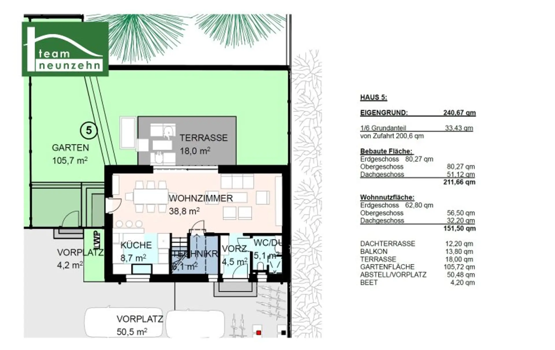 Jede Wohneinheit verfügt über großzügige Freiflächen wie Eigengarten, Terrasse und/oder Balkon und bietet damit zusätzlichen Lebensraum im Freien. Pro Haus können zwei PKW-Stellplätze erworben werden (je EUR 15.000). Die Außenanlagen sind geplant und werden zeitnah umgesetzt, wodurch ein stimmiges Gesamtbild entsteht.