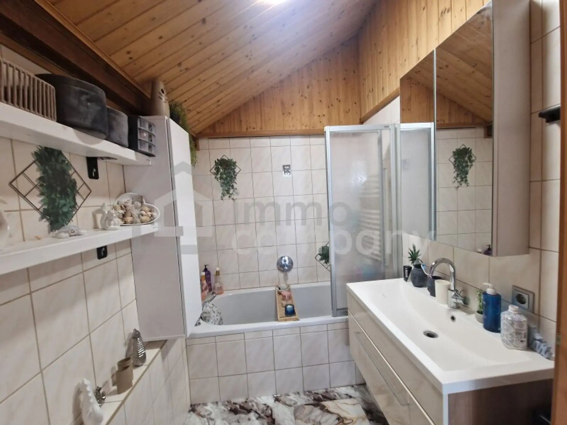 Das Badezimmer ist mit Fenster ausgestattet und bietet sowohl eine eine Dusche als auch eine Badewanne im Obergeschoss – ideal für entspannte Wohlfühlmomente nach einem langen Tag.