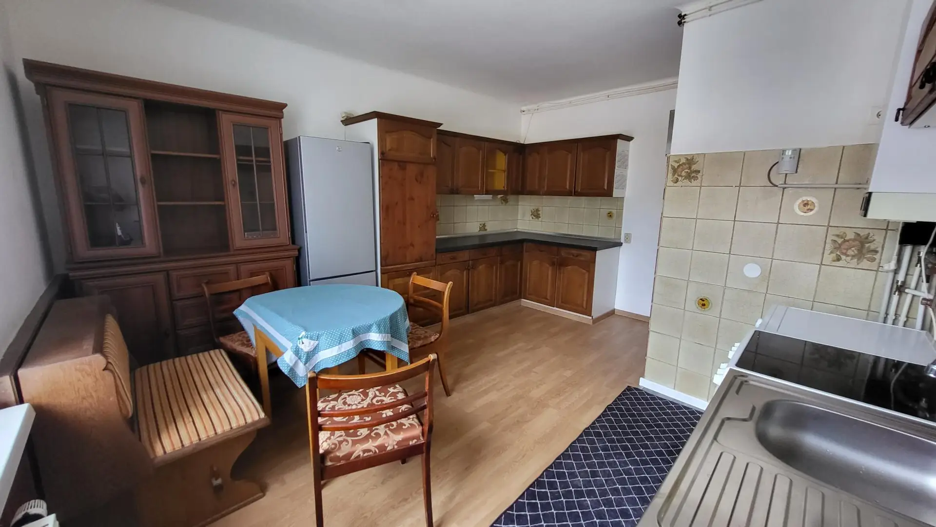 Vorraum, WC, Bad mit Sitzbadewanne und Waschbecken, Küche, 2 Zimmer.