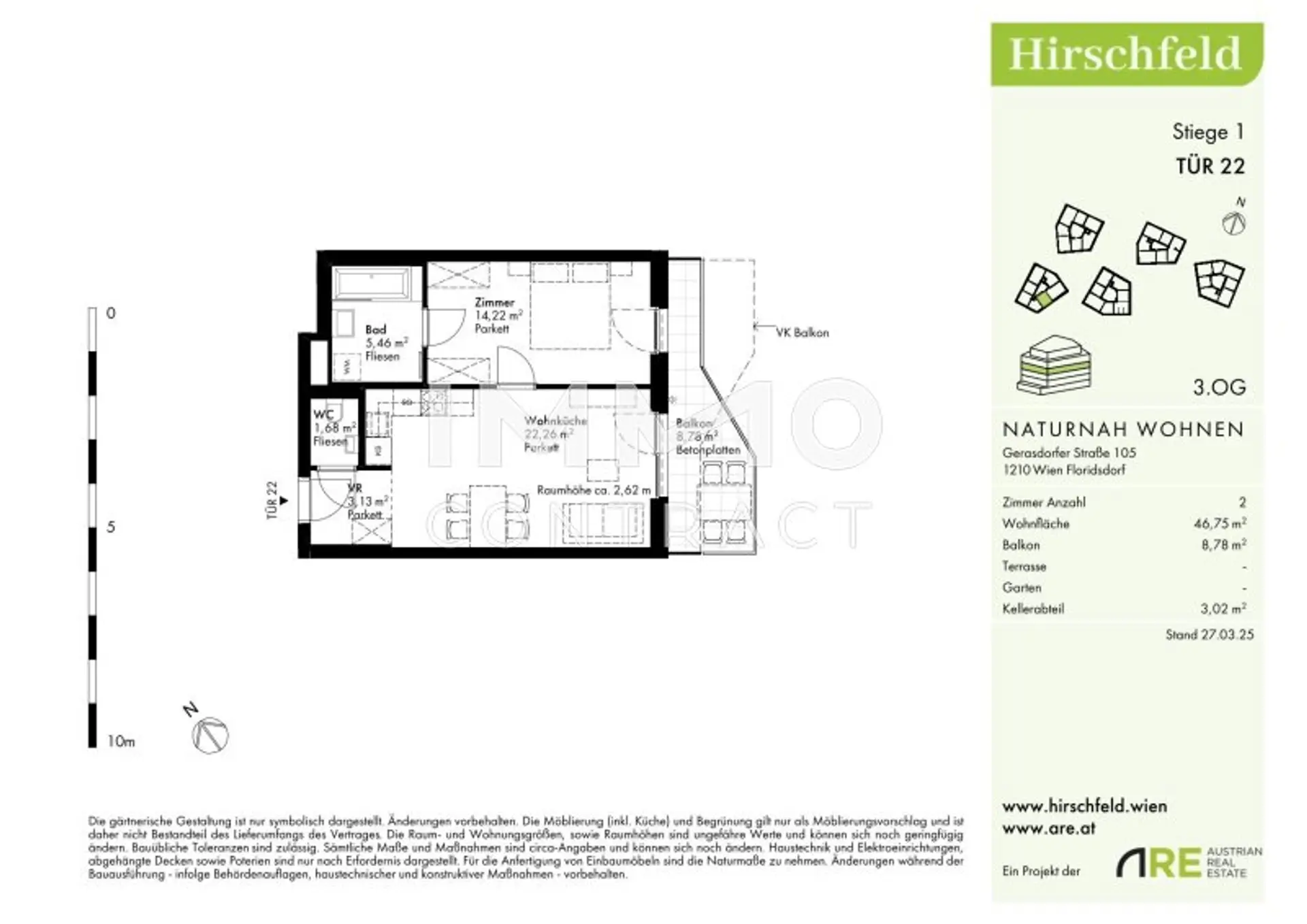 Hirschfeld ist ein beschauliches Viertel am Wiener Stadtrand. Die Metropole im Rücken verheißt jedem Nachhausekommen ein Naturerlebnis und Entspannung. Wer gerne mit den Wiener Linien unterwegs ist, nimmt am besten die Autobuslinie 32A ab Kollarzgasse bis zum U- und S-Bahn-Knotenpunkt Leopoldau. Von hier aus ermöglichen die U1 in Richtung Zentrum sowie die Schnellbahnlinien S1, S2 und S7 eine rasche Verbindung stadtein- und stadtauswärts. Alternativ verläuft die Straßenbahnlinie 31 entlang der Brünner Straße über Floridsdorf direkt bis Schottenring. Autofahrer profitieren von der nahegelegenen A22.