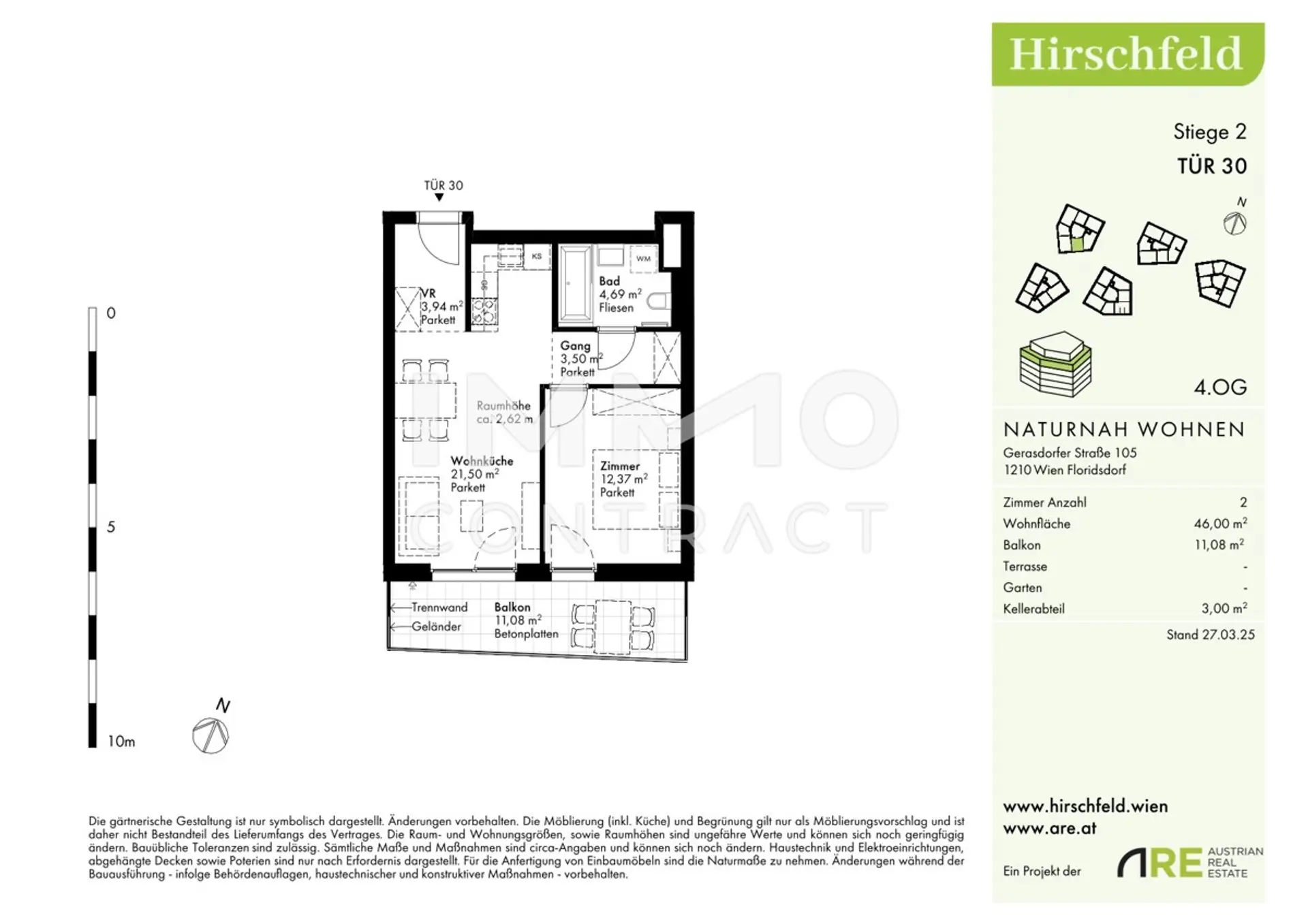Hirschfeld ist ein beschauliches Viertel am Wiener Stadtrand. Die Metropole im Rücken verheißt jedem Nachhausekommen ein Naturerlebnis und Entspannung. Wer gerne mit den Wiener Linien unterwegs ist, nimmt am besten die Autobuslinie 32A ab Kollarzgasse bis zum U- und S-Bahn-Knotenpunkt Leopoldau. Von hier aus ermöglichen die U1 in Richtung Zentrum sowie die Schnellbahnlinien S1, S2 und S7 eine rasche Verbindung stadtein- und stadtauswärts. Alternativ verläuft die Straßenbahnlinie 31 entlang der Brünner Straße über Floridsdorf direkt bis Schottenring. Autofahrer profitieren von der nahegelegenen A22.