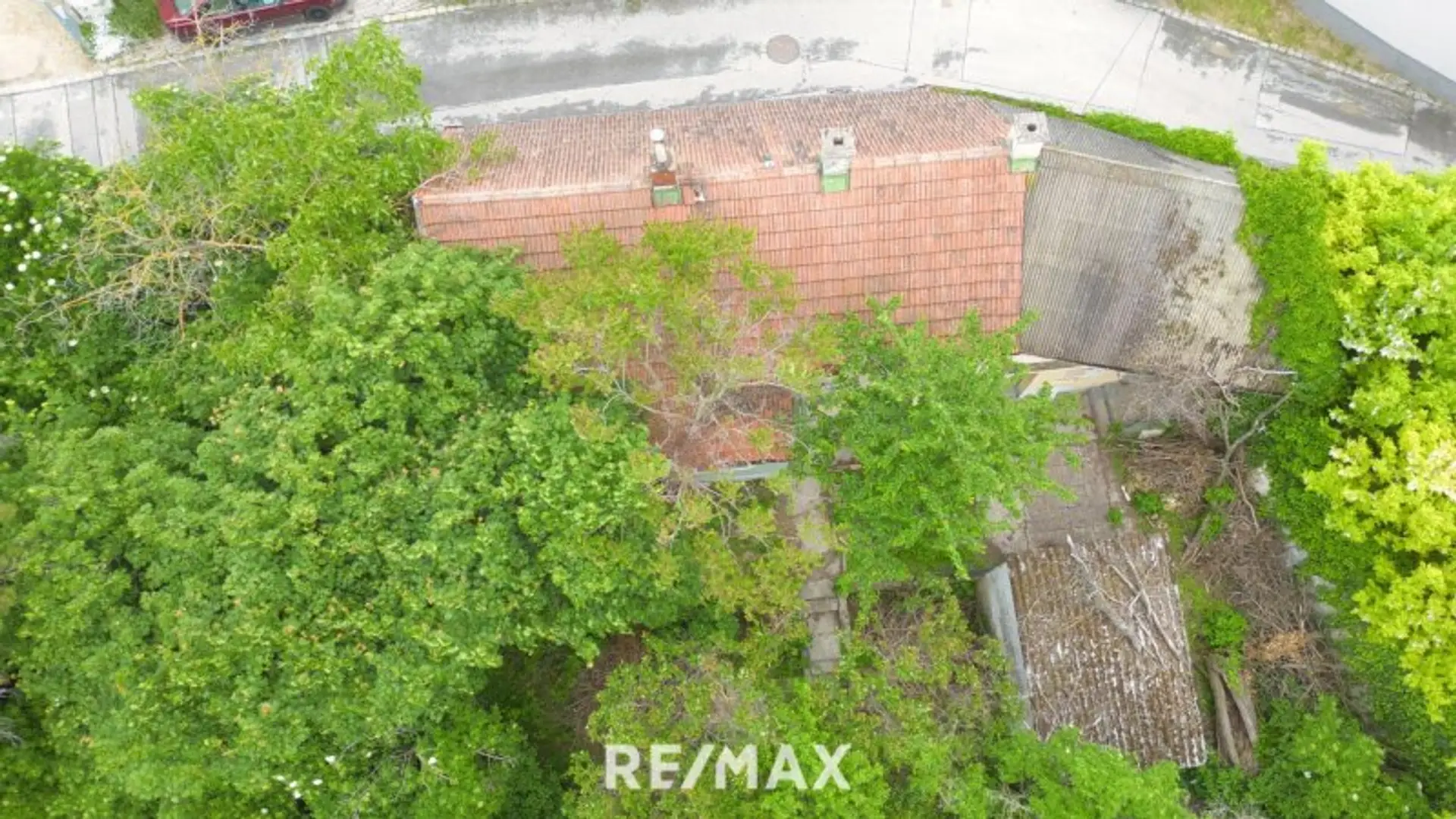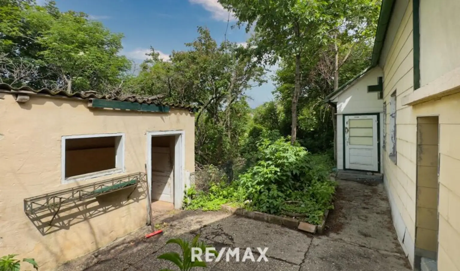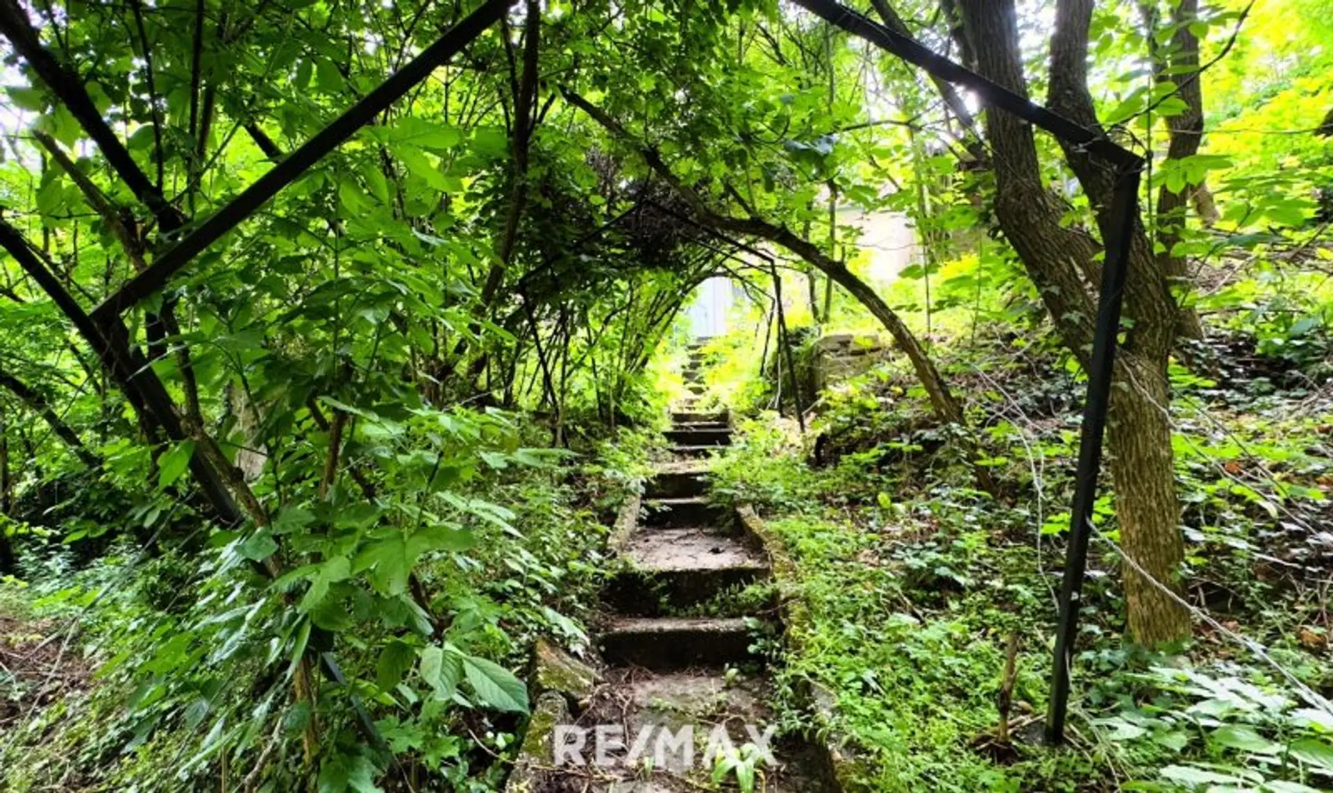 Das Grundstück mit Hanglage ist mit Bäumen und Sträuchern bewachsen.