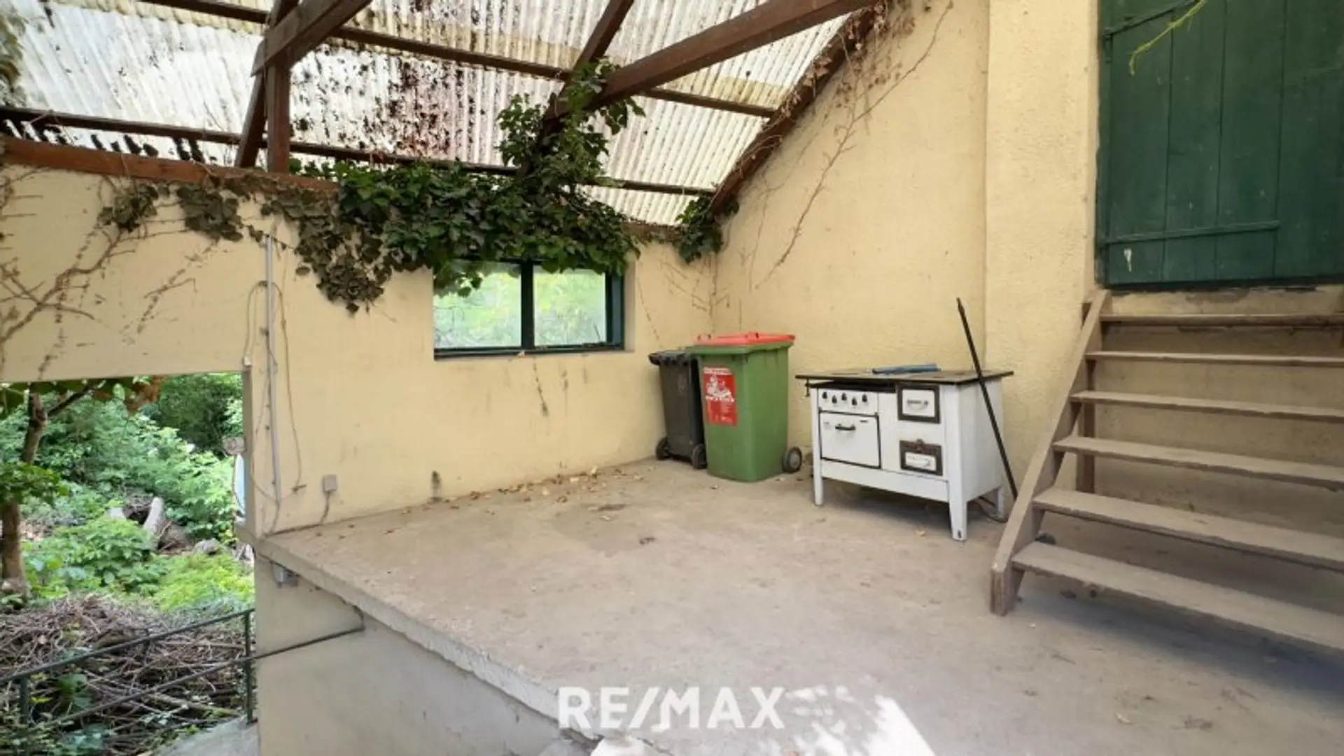 Der Eingang von der Straße erfolgt über das Dachgeschoß über eine Treppe