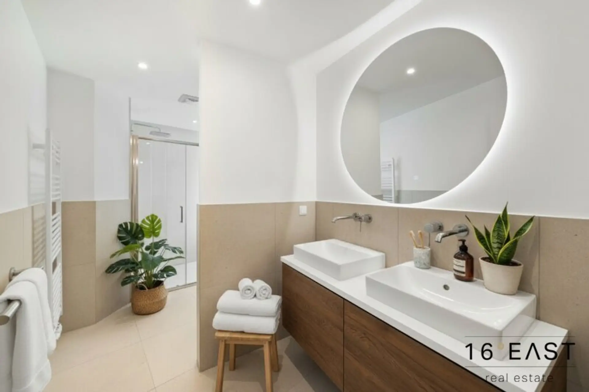 * Exklusive Bäderausstattung: Doppelwaschbecken, Dusche, Handtuchwärmer