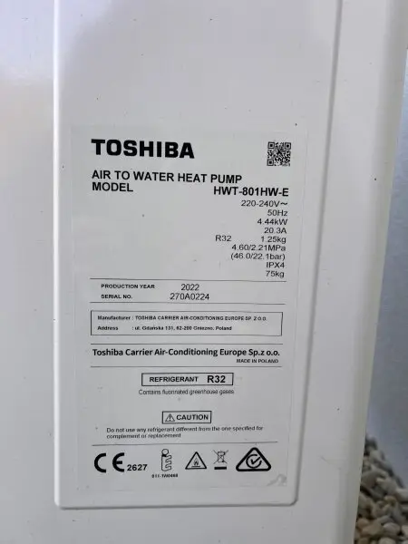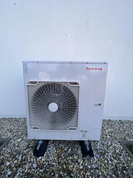 * Technikraum (ca. 5 m²) mit moderner Toshiba‑Luftwärmepumpe und 500‑Liter‑Pufferspeicher