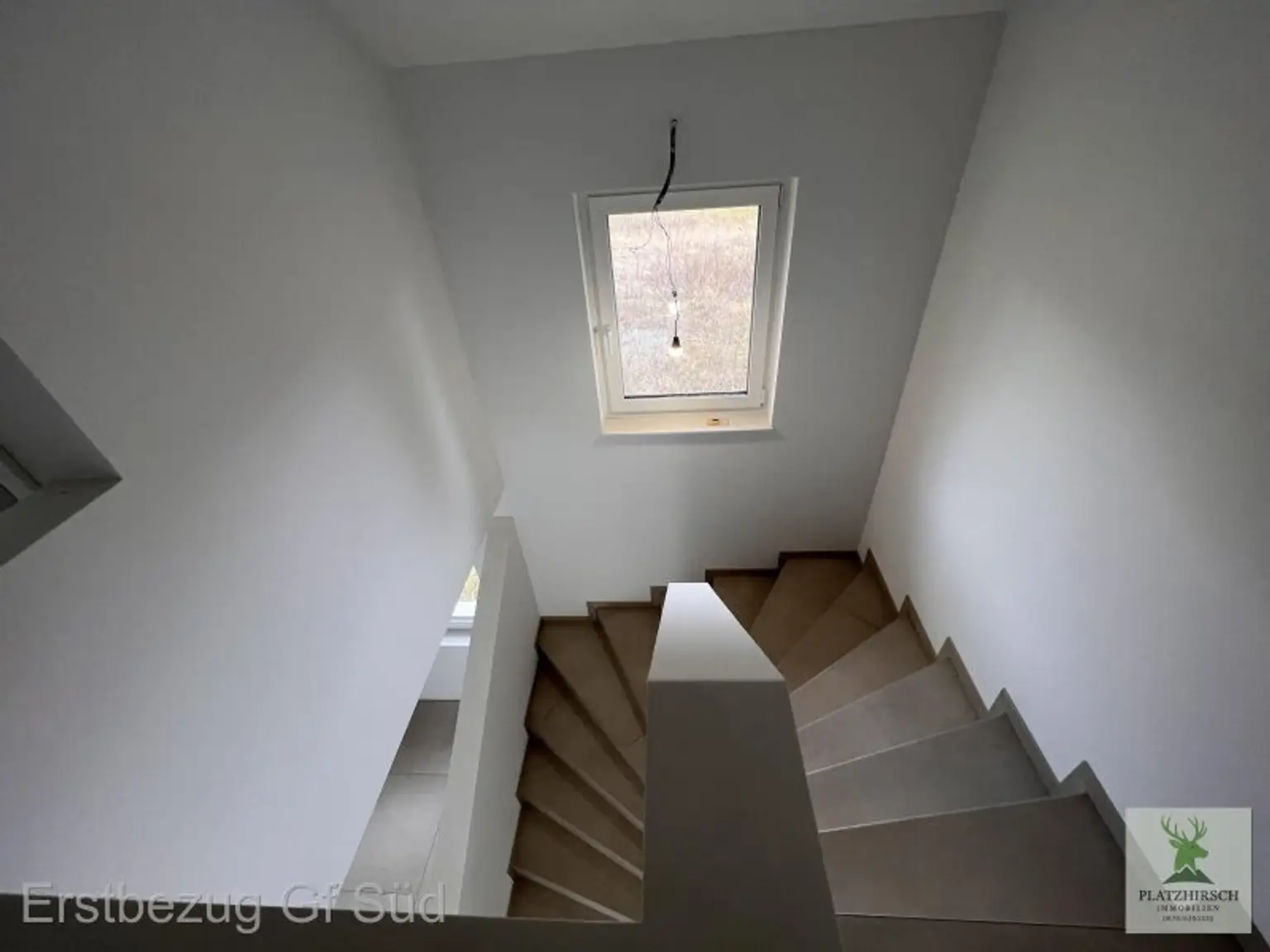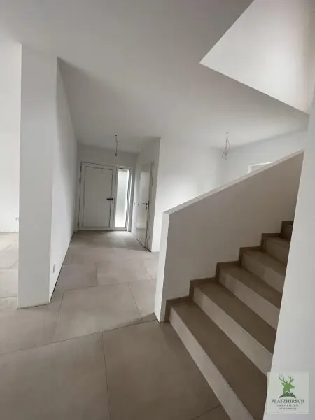 Ein hochwertig verkleideter Vollholz‑Stiegenaufgang führt ins großzügige Obergeschoss.