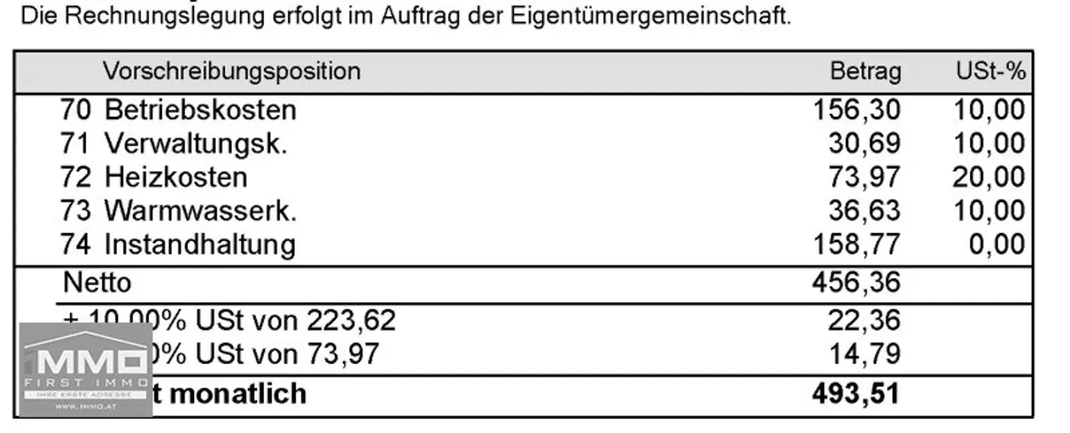 In der monatlichen Vorschreibung in der Höhe von EUR 469,19 sind neben den Betriebskosten auch bereits die Kosten für Heiz- und Warmwasser, Instandhaltung sowie ein Sanierungsdarlehen (endet am 31.04.2031) inkludiert. Das Haus wurde im Jahr 1975 mit öffentlichen Mitteln des Landes NÖ errichtet.