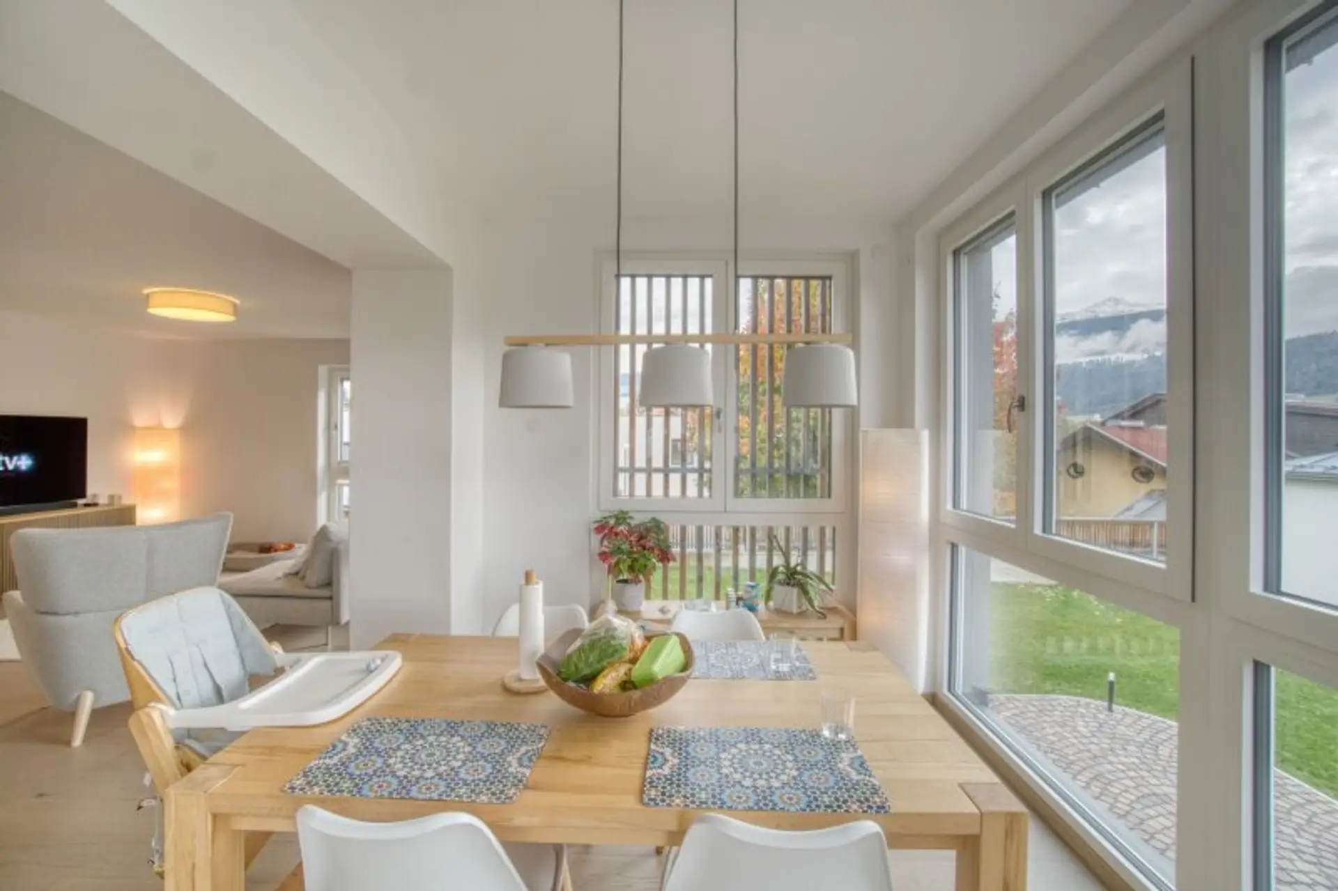 * Offenes Wohnkonzept mit Design-Küche, Essbereich und Wohnzimmer mit herrlichem Ausblick auf die umliegende Bergwelt