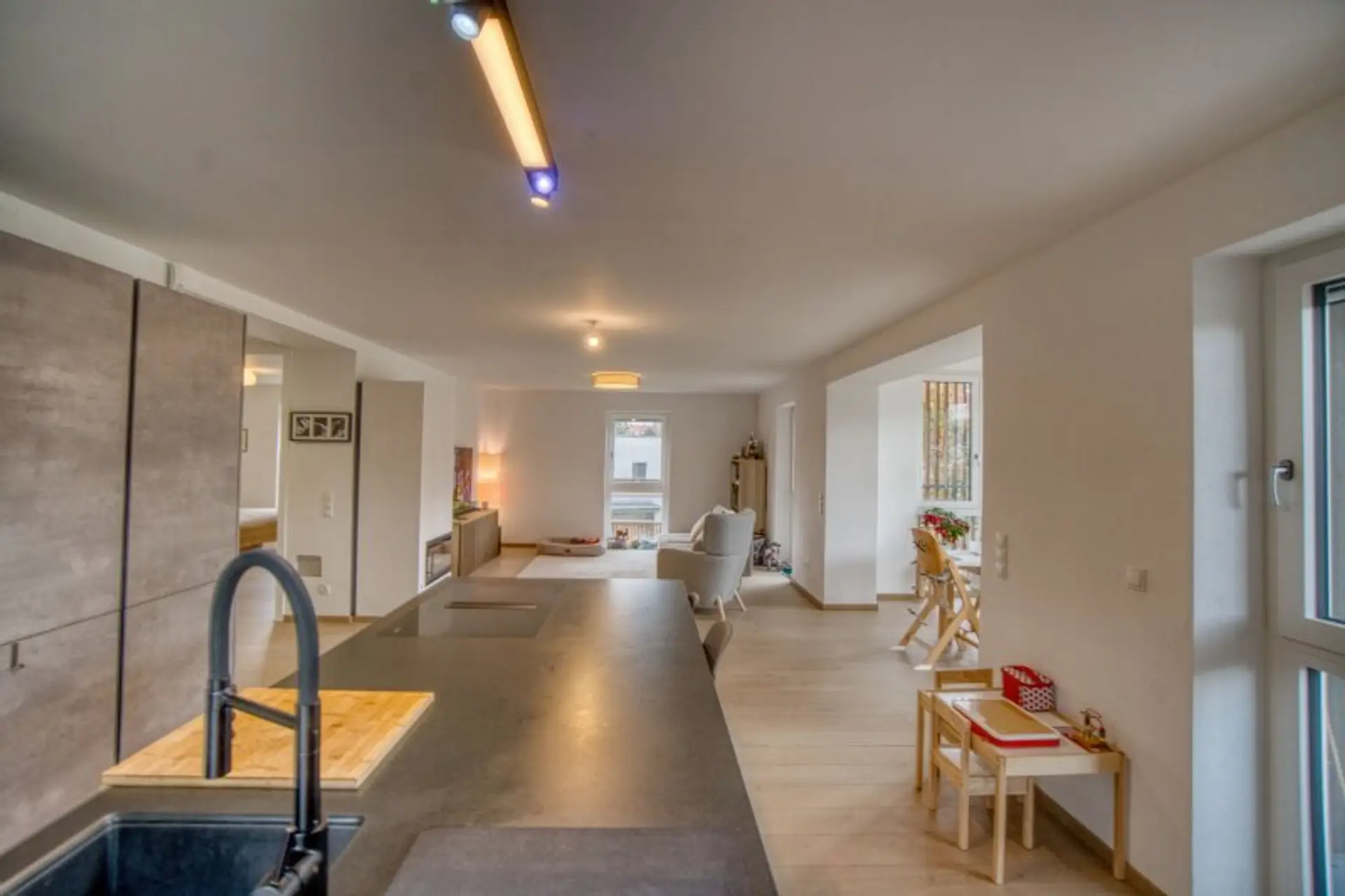 * Hochwertige Ausstattung durch Holz- und Fliesenböden.