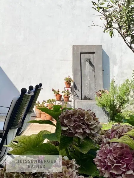 Der Garten ist eine wahre Oase mit Terrassen, großen Rasenflächen, einem Brunnen und schön angelegten und eingewachsenen Bäumen, Sträuchern und Blumenstauden. Durch die ideale Ost-/Westausrichtung finden sich zu jeder Tageszeit sowohl schöne Sonnen- als auch Schattenplätze.