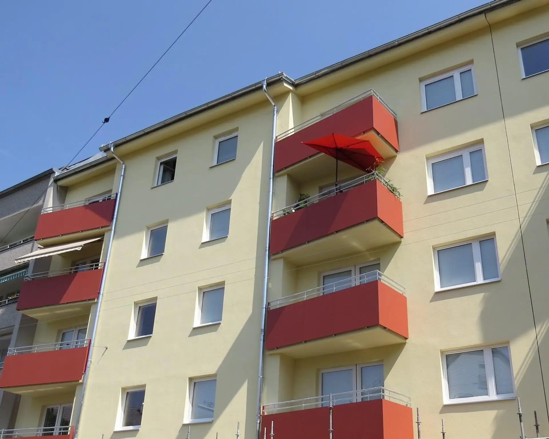 Thewosan-Sanierung: Neue Wärmeschutzfassade, neue Balkonverkleidung, neuer, moderner Anstrich