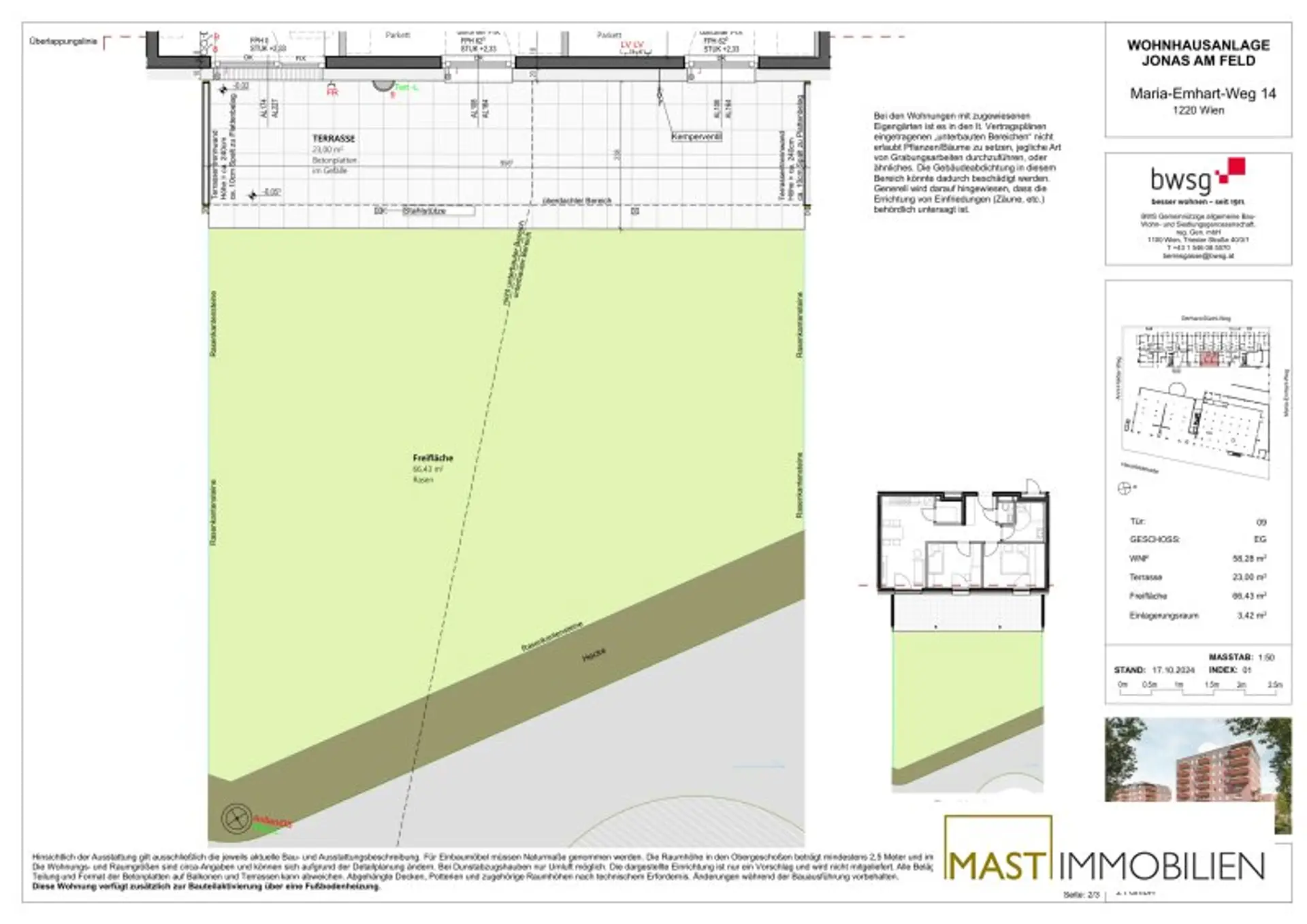 Die Wohnung befindet sich im EG und verfügt über 58,28 m² Wohnfläche + eine 66,43 m² große Freifläche + 23 m² große Terrasse