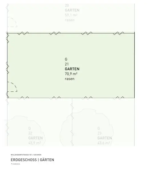 Für alle Eigentümer, auch in den oberen Geschossen, offeriert sich die besondere optionale Möglichkeit eines eigenen Gartenabteils. Alle Gärten werden mit Strom- und Wasseranschluss ausgeführt.