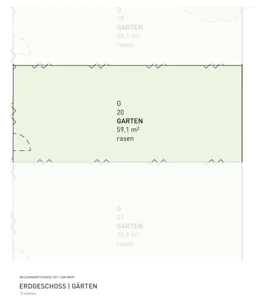 Für alle Eigentümer, auch in den oberen Geschossen, offeriert sich die besondere optionale Möglichkeit eines eigenen Gartenabteils. Alle Gärten werden mit Strom- und Wasseranschluss ausgeführt.