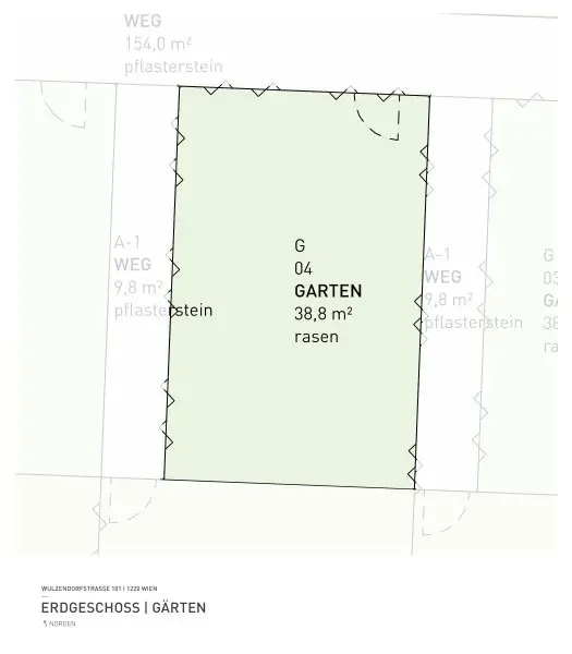 Für alle Eigentümer, auch in den oberen Geschossen, offeriert sich die besondere optionale Möglichkeit eines eigenen Gartenabteils. Alle Gärten werden mit Strom- und Wasseranschluss ausgeführt.